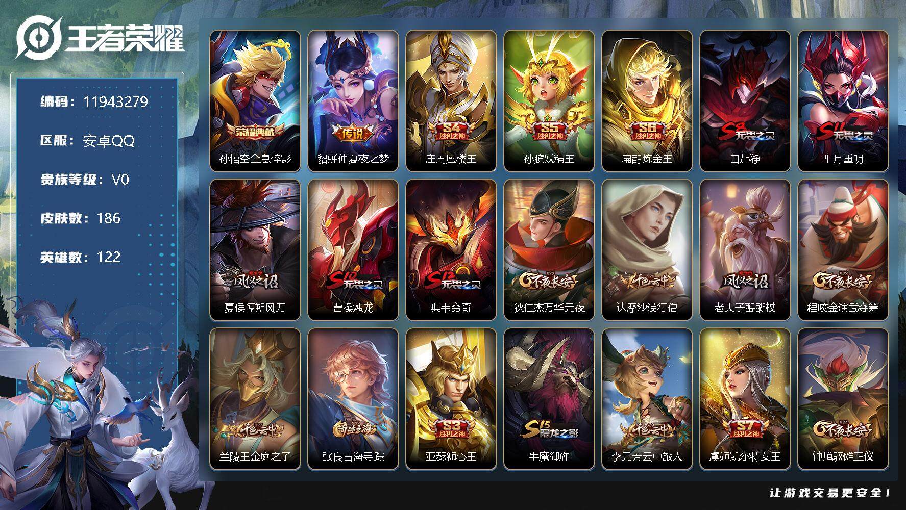 【商品标题】:安卓Q-V7-至尊星耀I段位-125英雄-193皮肤-1典藏-0