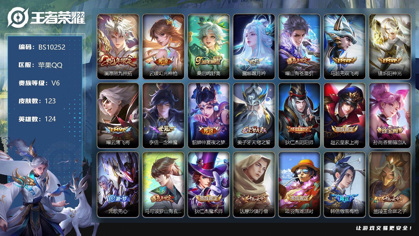 苹果QQ 皮肤282 英雄126 典藏1 传说7 其他皮肤104 至尊星耀-有和平营地王者皮肤多多