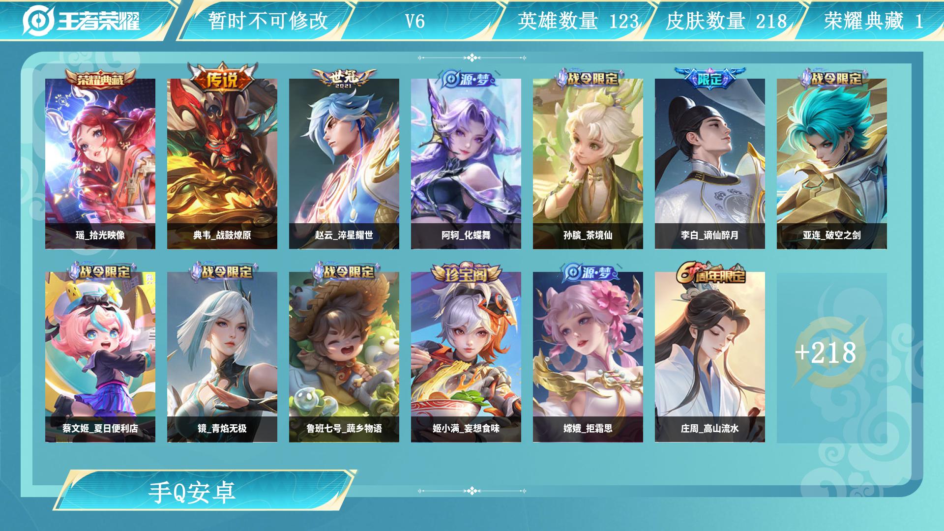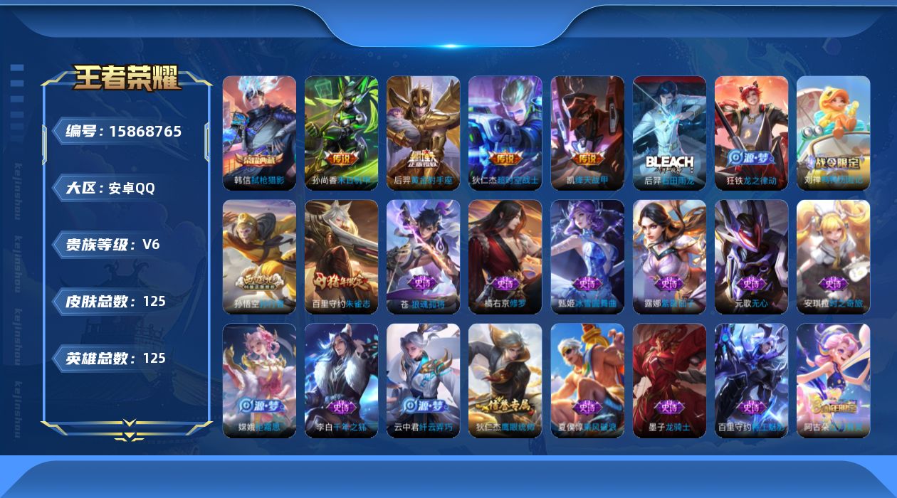 打野33段 安卓Q-V6-125英雄-202皮肤-1典藏皮肤-1珍品传说-6传