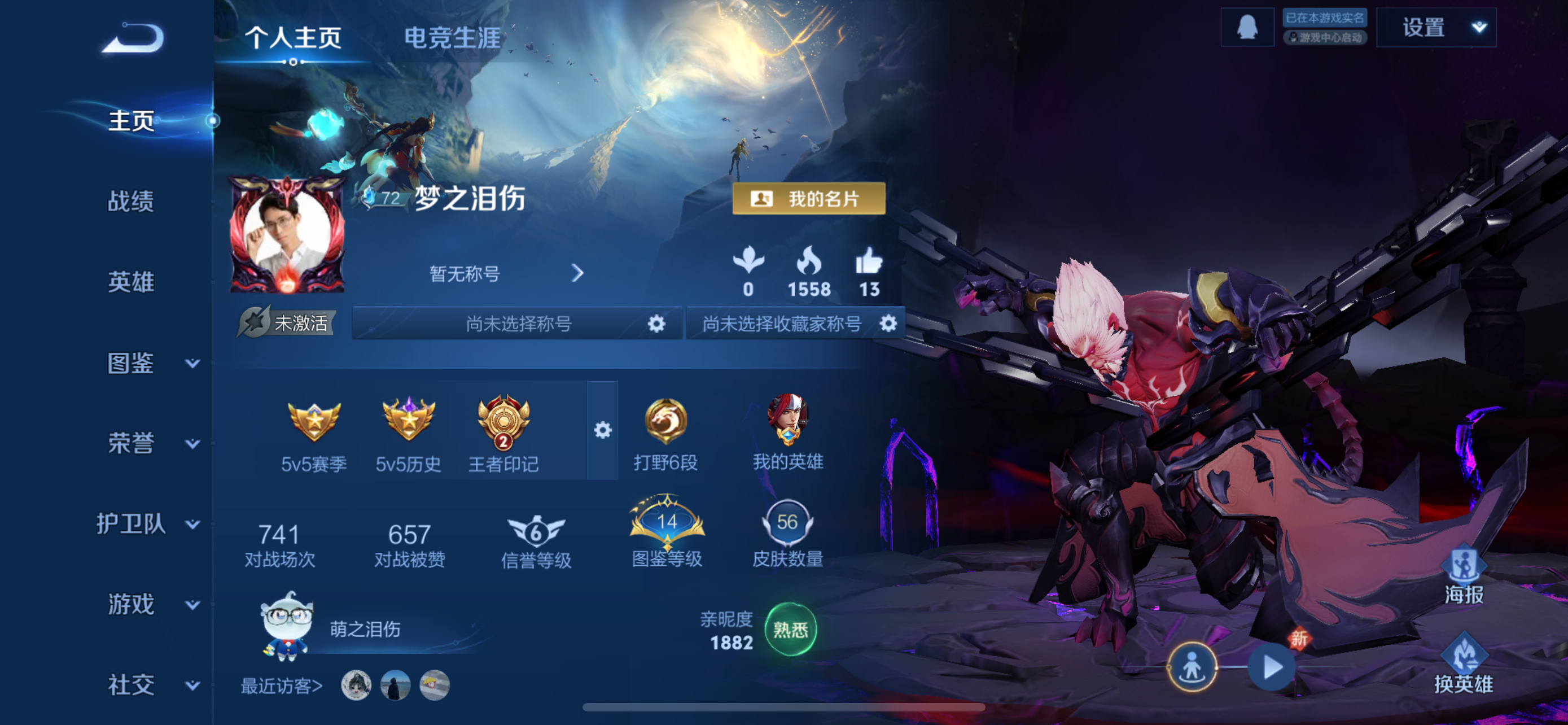 贵族等级: V5 英雄数: 76 皮肤数: 42 星传说: 幽冥火 传说皮: