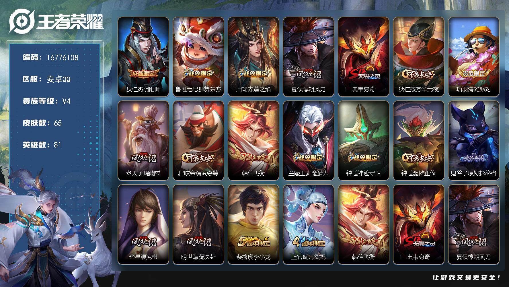 【16776108】安卓Q-V0-荣耀黄金IV段位-81英雄-65皮肤-11史