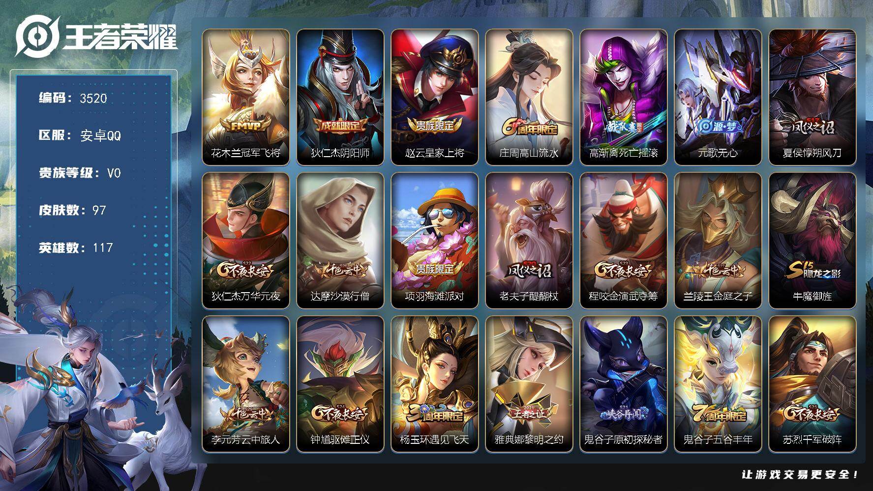 【自玩小号可以二次实名】安卓Q-V0-尊贵铂金III段位-117英雄-97皮