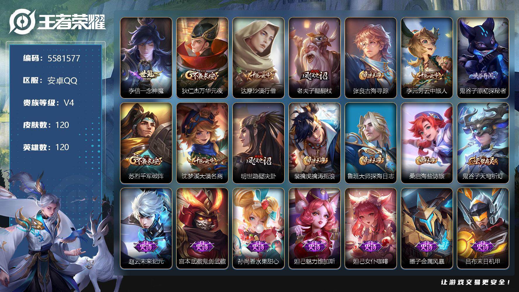 [5581577]实名: 可修改 贵族等级: V4 英雄数: 120 皮肤数: