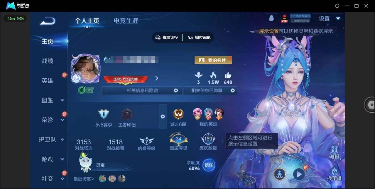 实名: 可修改 贵族等级: V6 英雄数: 118 皮肤数: 169 荣耀水晶