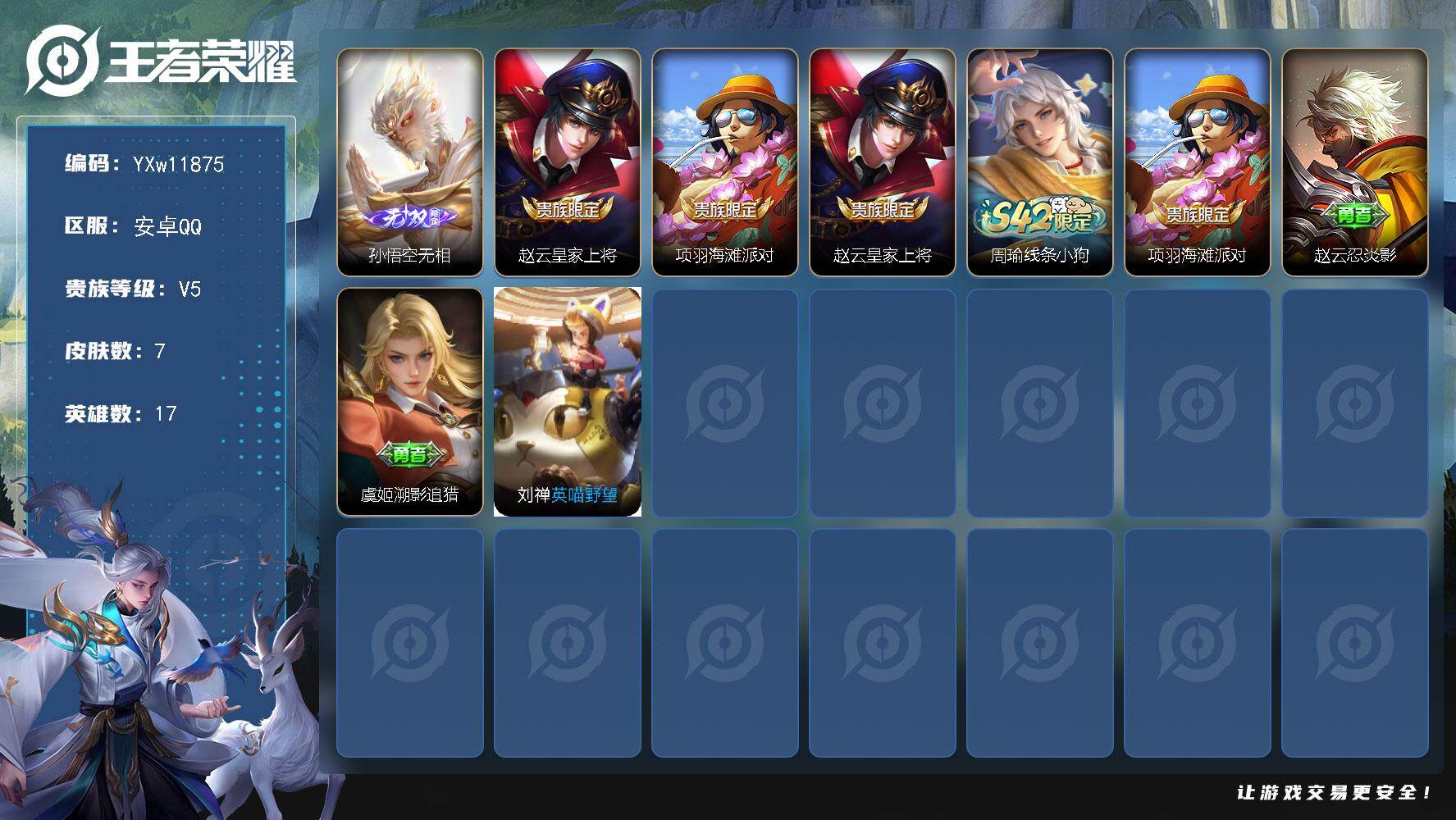 【精品无双小号·无相·可二次】YXw11875-安卓Q-17英雄-7皮肤-0王