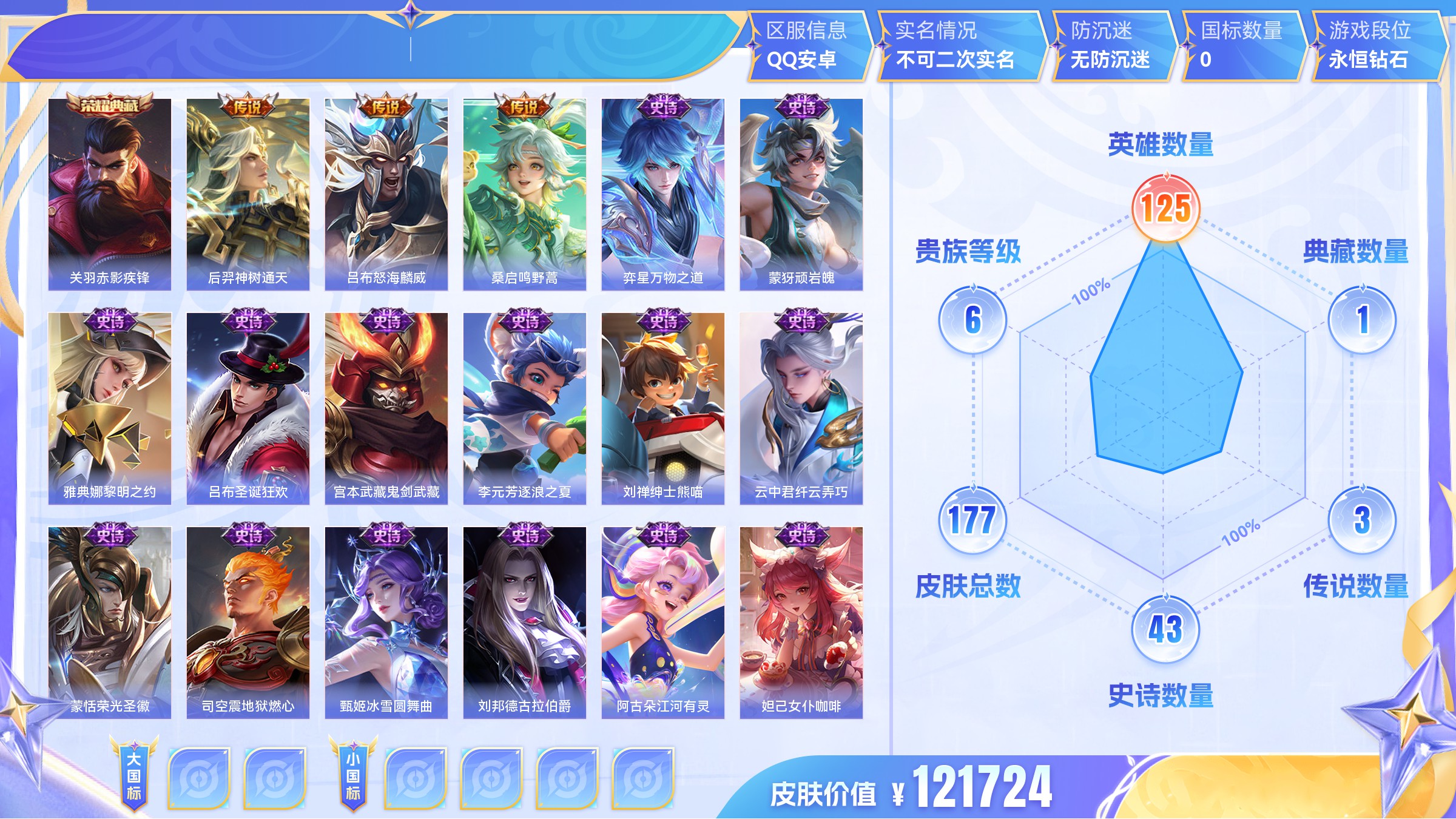 V6-永恒钻石III段位-122英雄-182皮肤-0典藏-0珍品无双-0无双-0珍品传说-3传说-44史诗