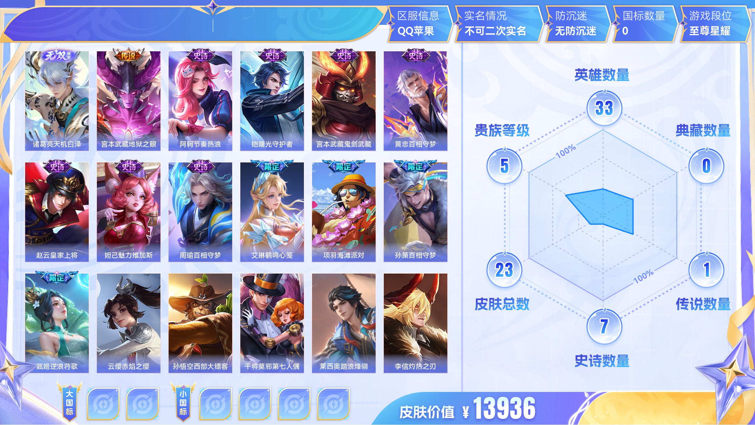 无双1 传说1 史诗7 限定7 英雄33 皮肤23 稀