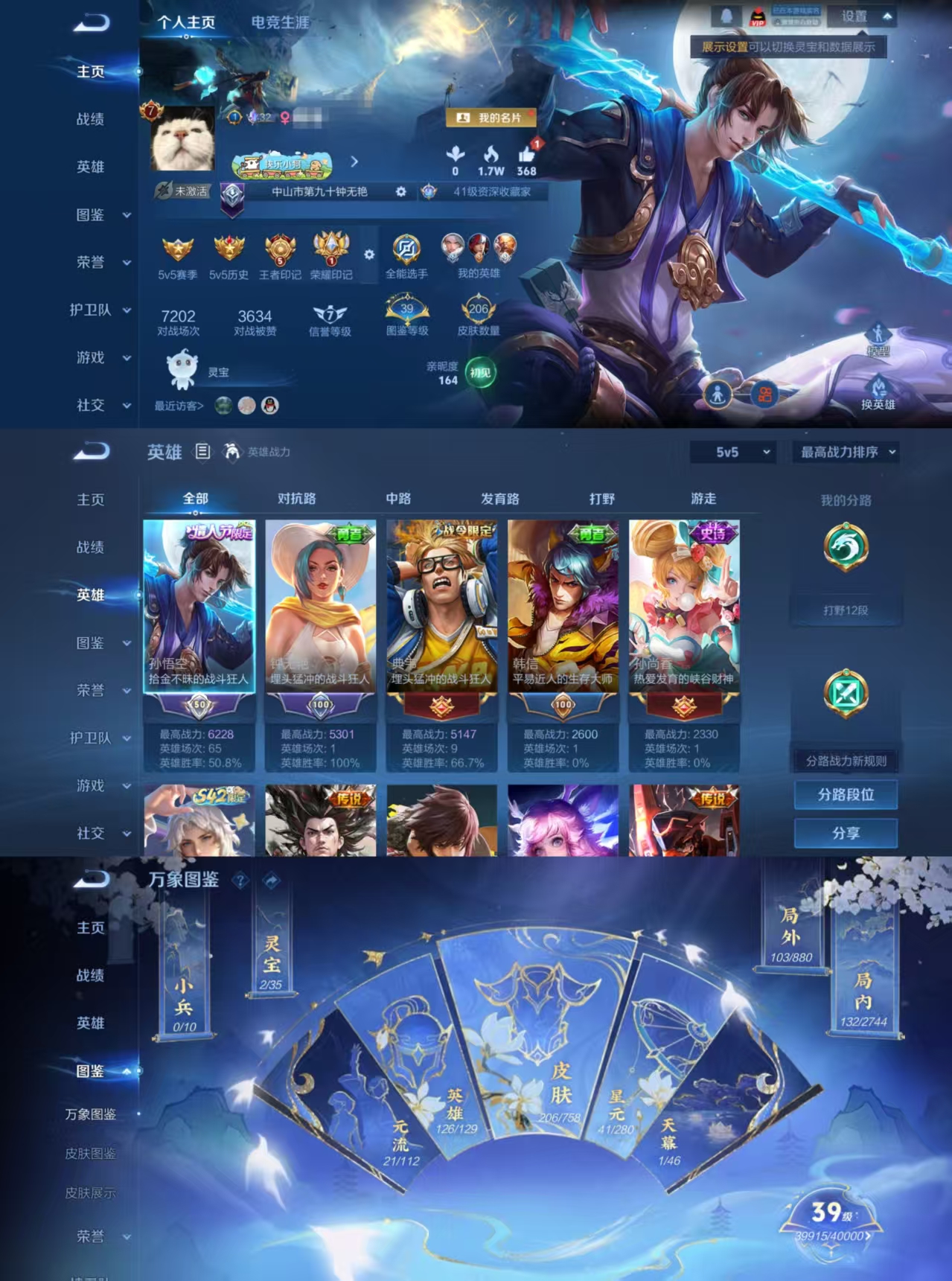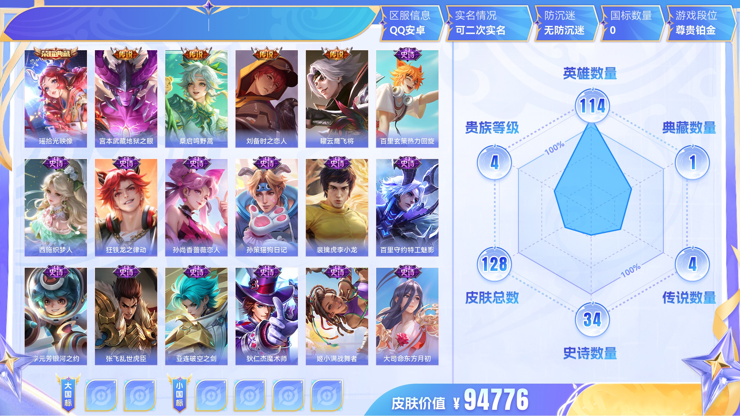 典藏1 传说4 史诗34 限定39 英雄114 皮肤12