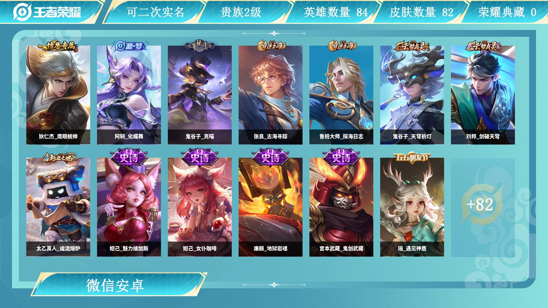 老号微信,一切正常皮肤数82史诗皮肤数12英雄数102营地i