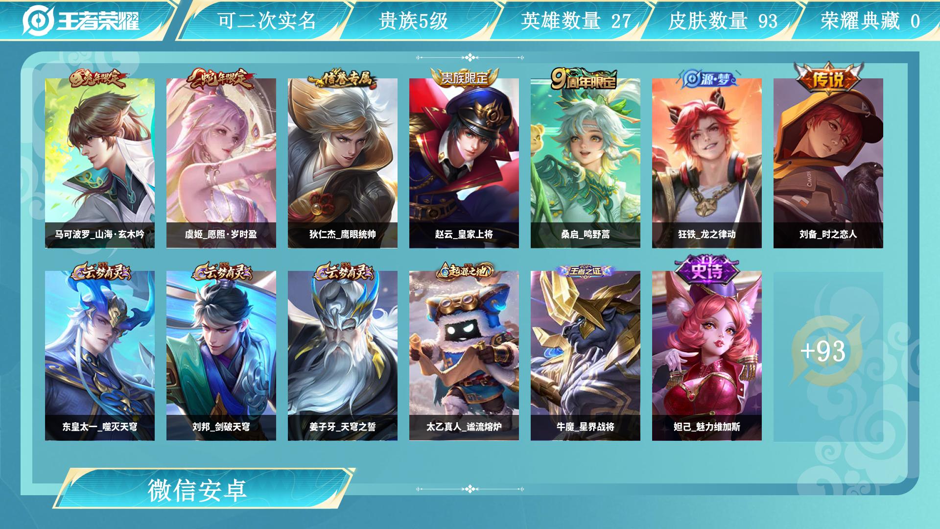 小号微信一切正常,安全靠谱!王者成品号皮肤数93传说皮肤数3