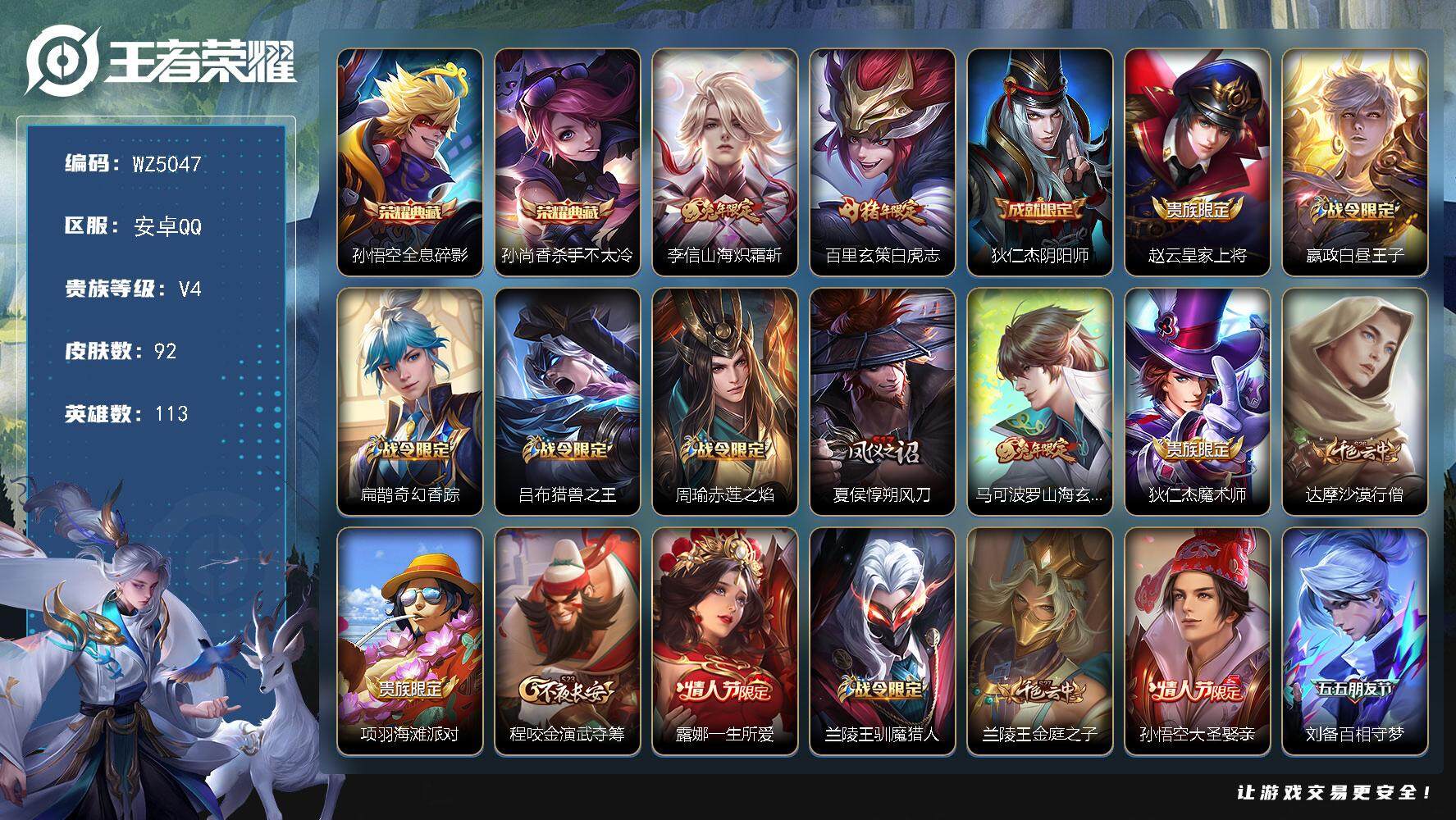 安卓Q-V4-至尊星耀III段位-113英雄-92皮肤-2典藏-0珍品无双-0
