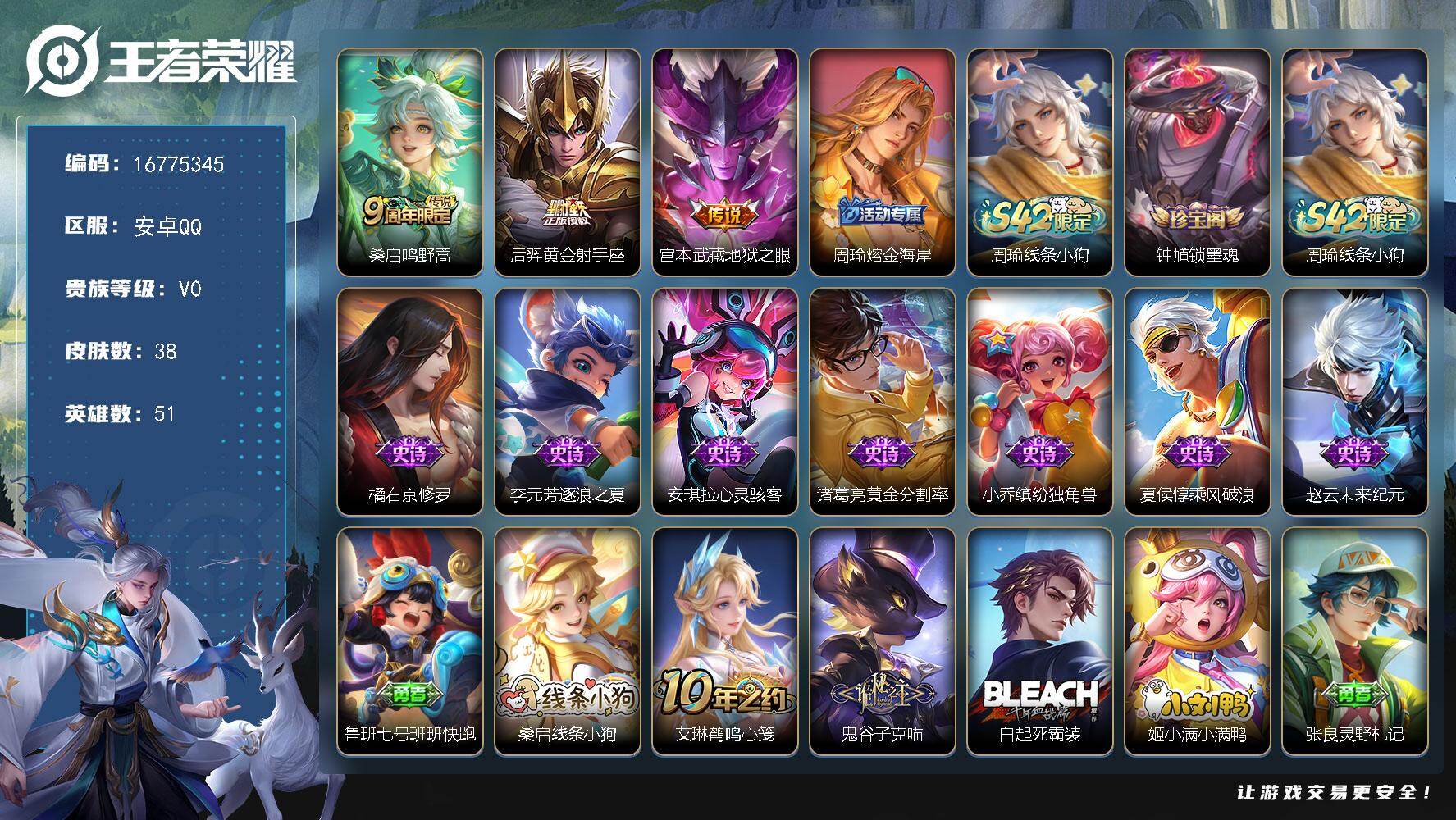 【16775345】安卓Q-V0-荣耀黄金IV段位-51英雄-38皮肤-3传说