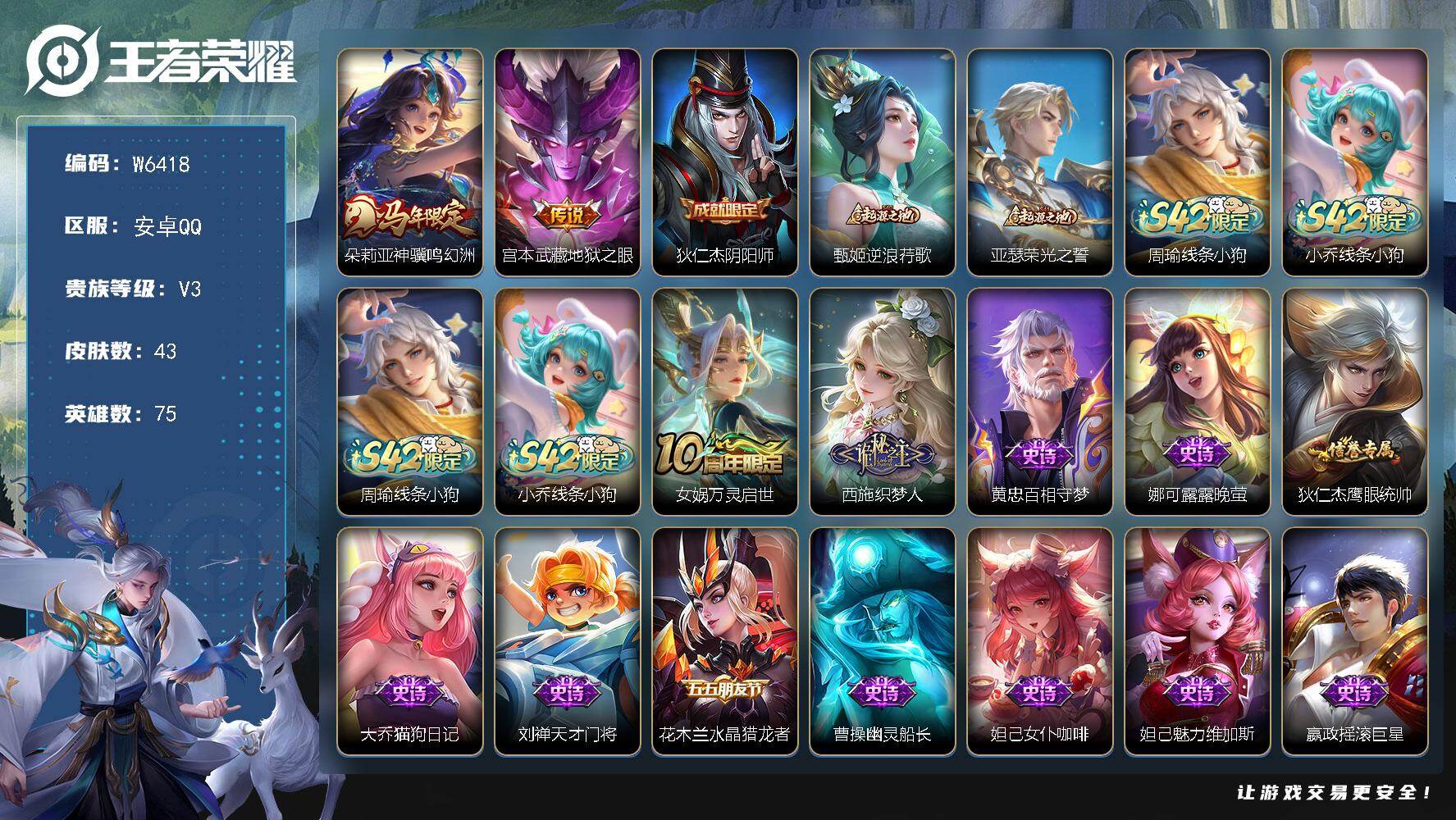 【鸣幻洲 3传说可秒换绑】安卓QQ-42英雄-10皮肤【传
