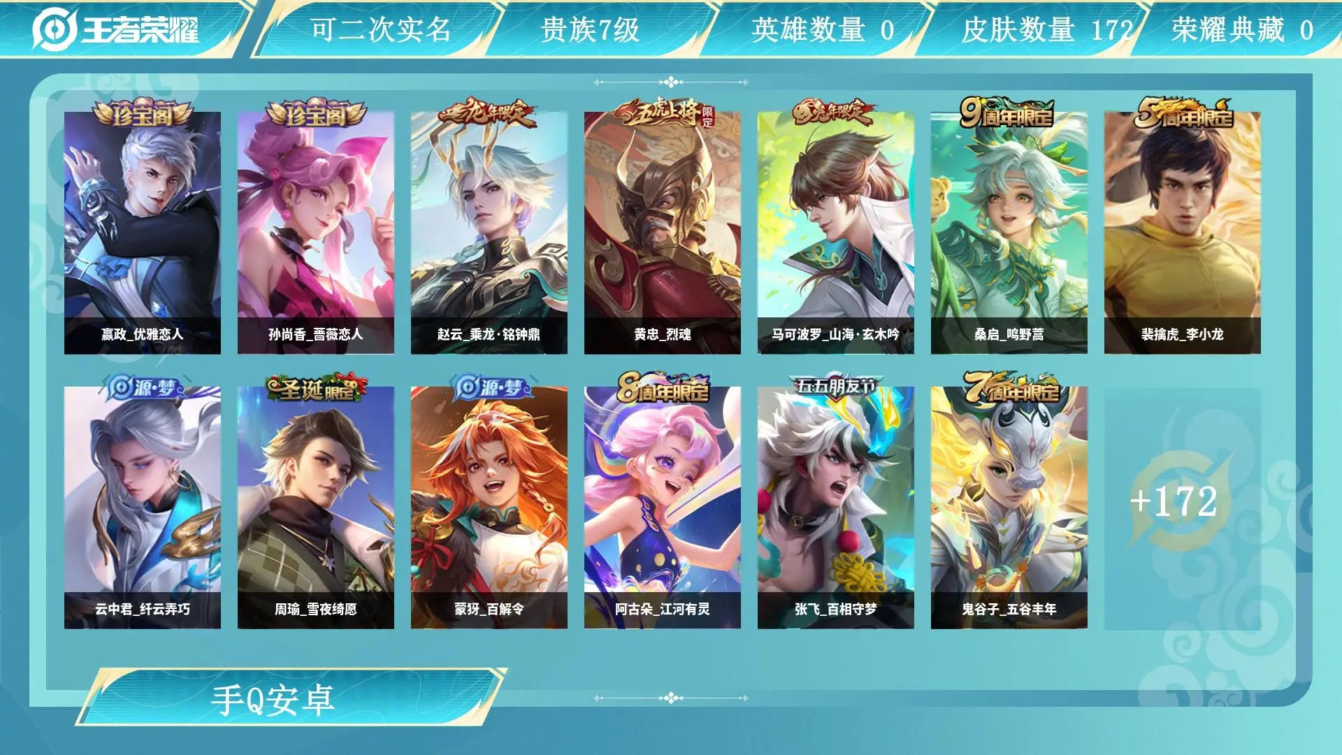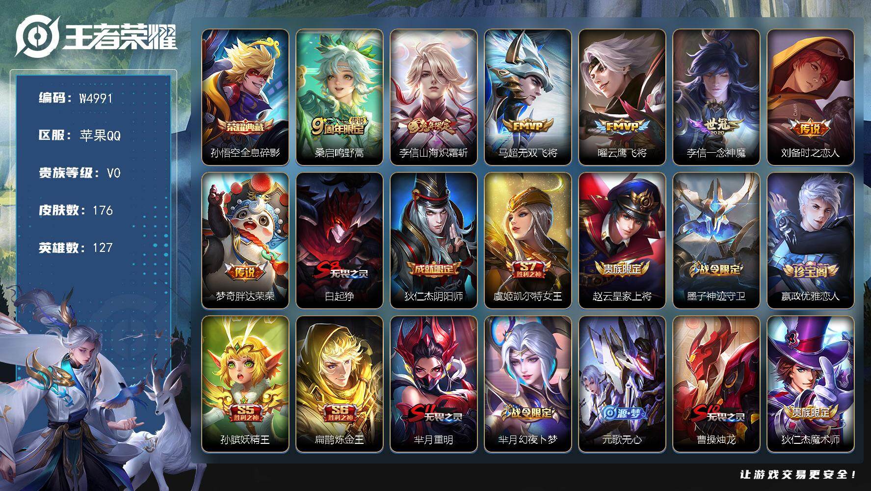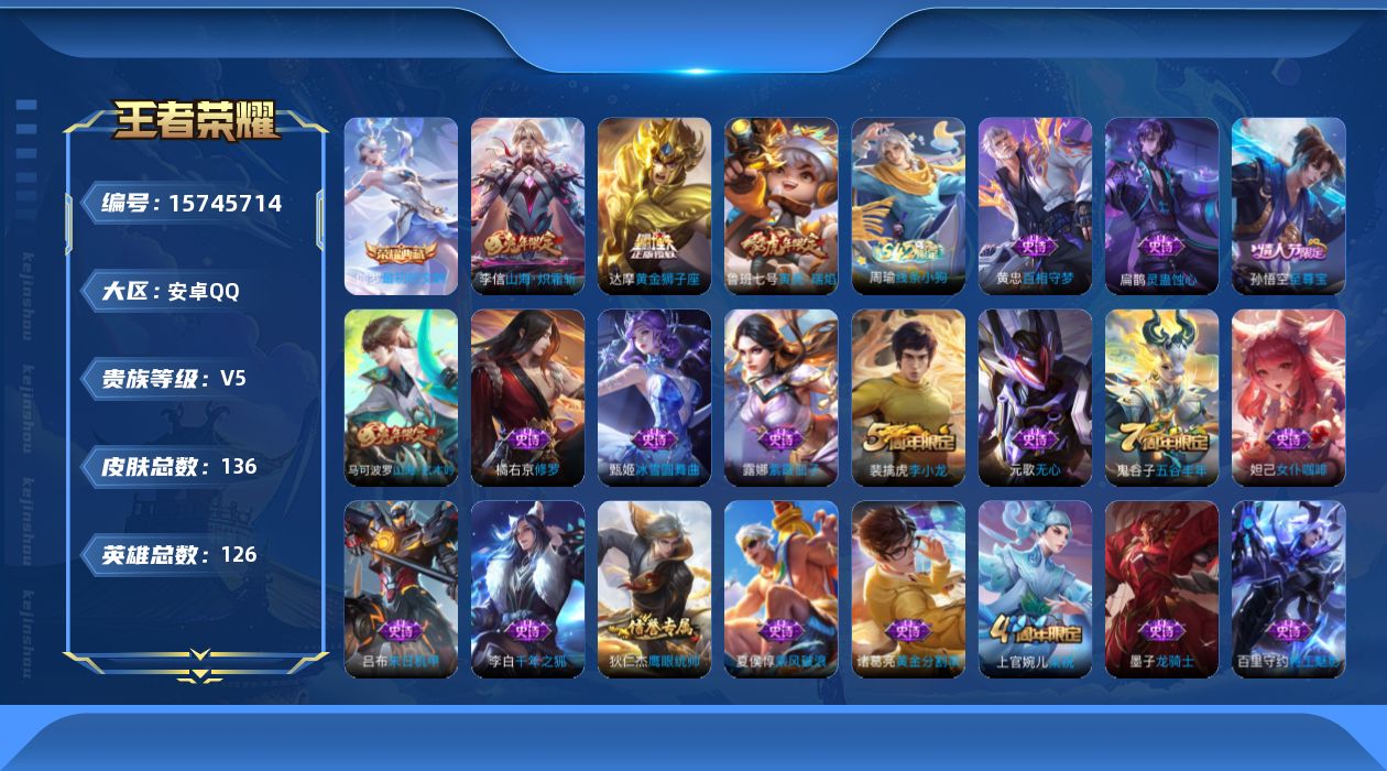 有二次-贵7-127英雄-176皮肤-1典藏-7传说-57限定-1天幕-3按键-贵族积分2.9w