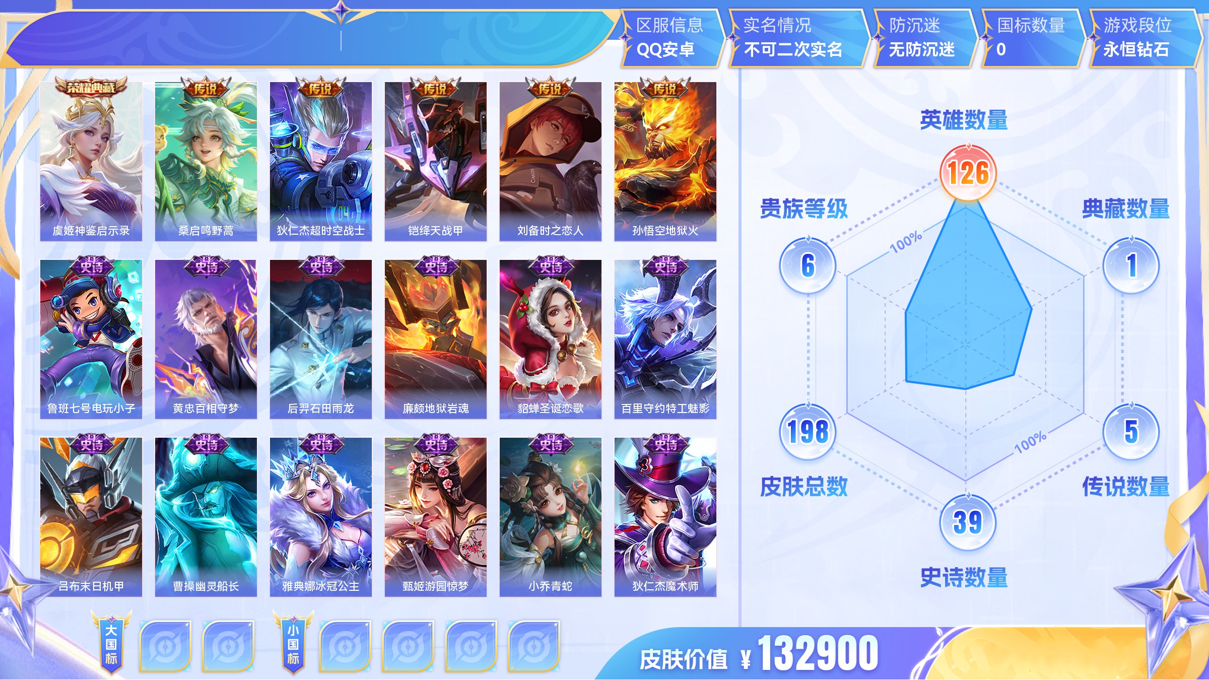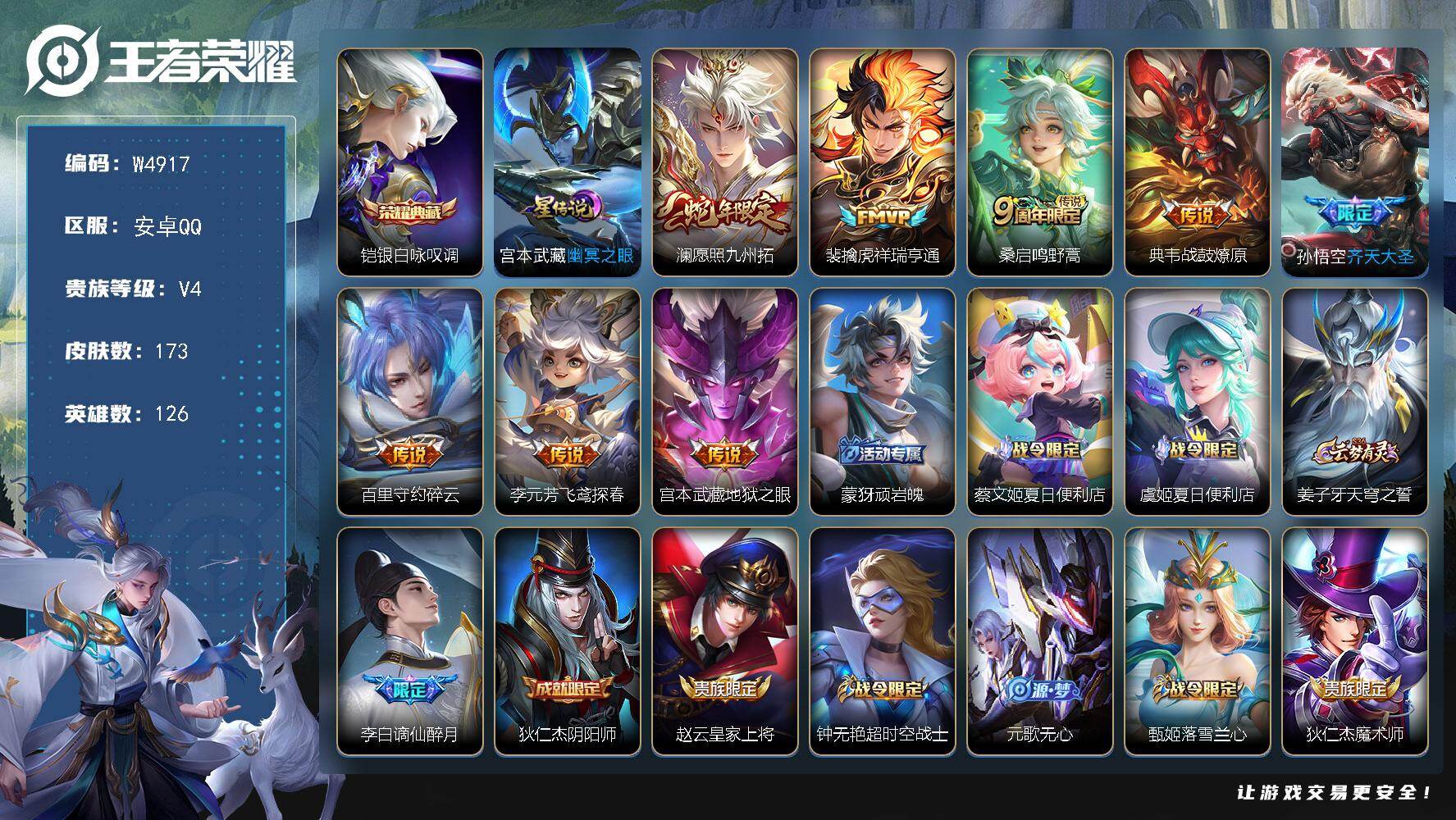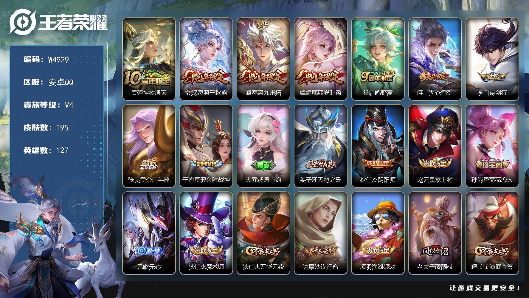 有二次-贵7-127英雄-176皮肤-1典藏-7传说-57限定-1天幕-3按键-贵族积分2.9w