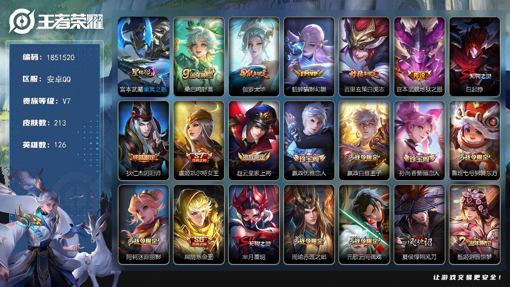 安卓Q-V7 -126英雄-215皮肤-1典藏皮肤-1珍品传说-2传说-59