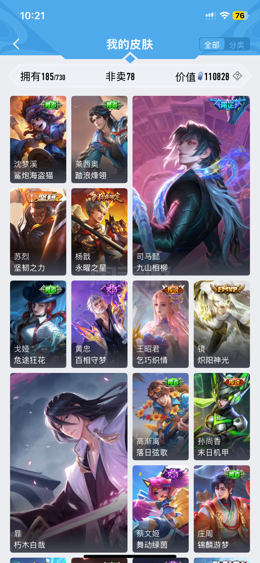 李白典藏+炽阳镜+挚爱孙策皮肤数量270印记总数22典藏皮肤