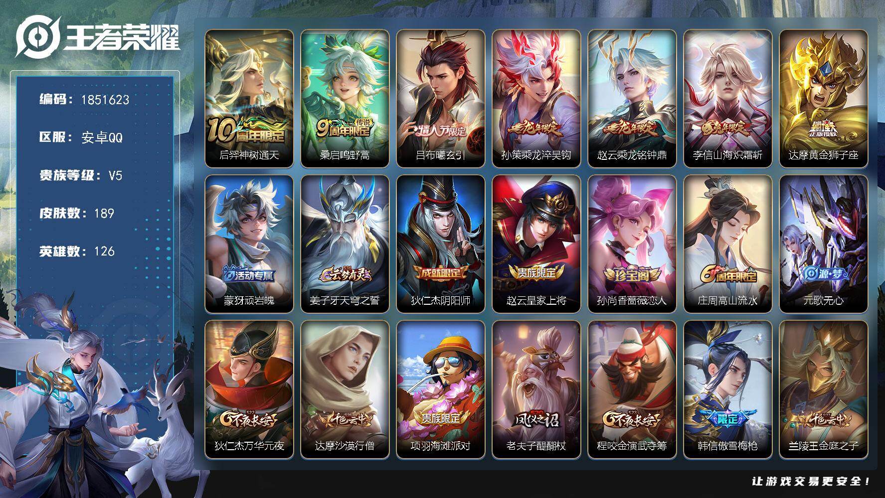孙悟空至尊宝,韩信逐梦之影,李白凤求凰,诸葛亮武陵仙君,玄策白虎志,六年老玩家不想玩了有意者可以聊聊
