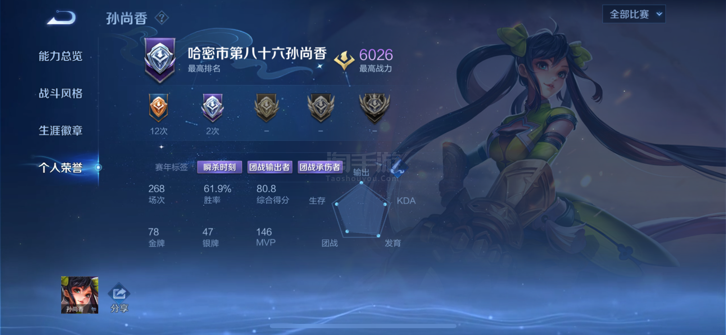 贵族等级: V4 英雄数: 87 皮肤数: 37 限定皮: 诗剑行