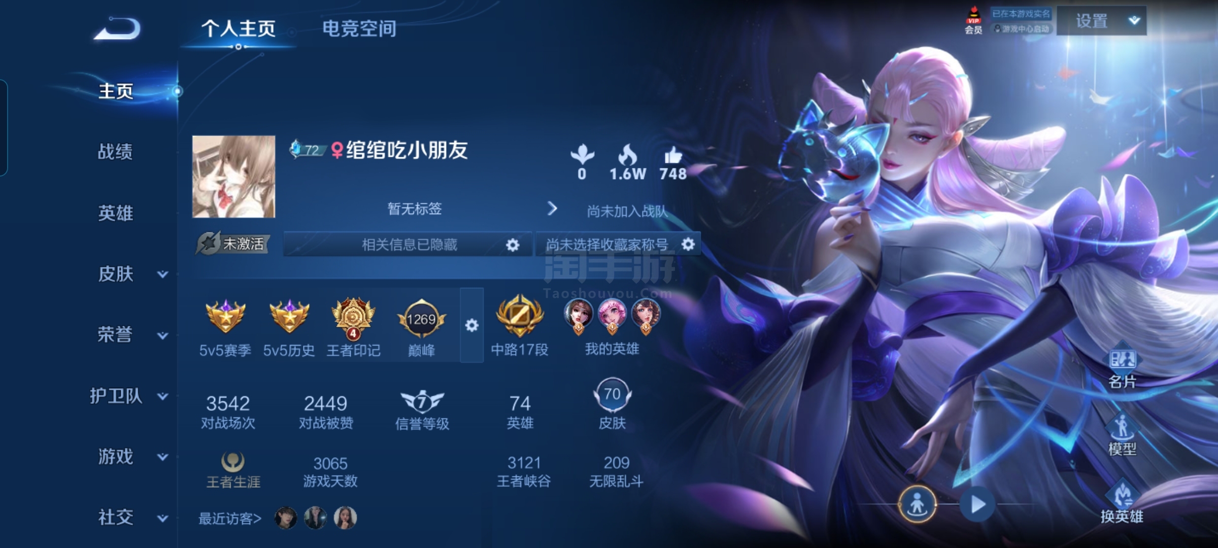 实名: 可修改 贵族等级: V4 英雄数: 89 皮肤数: 67 传说皮: 澜
