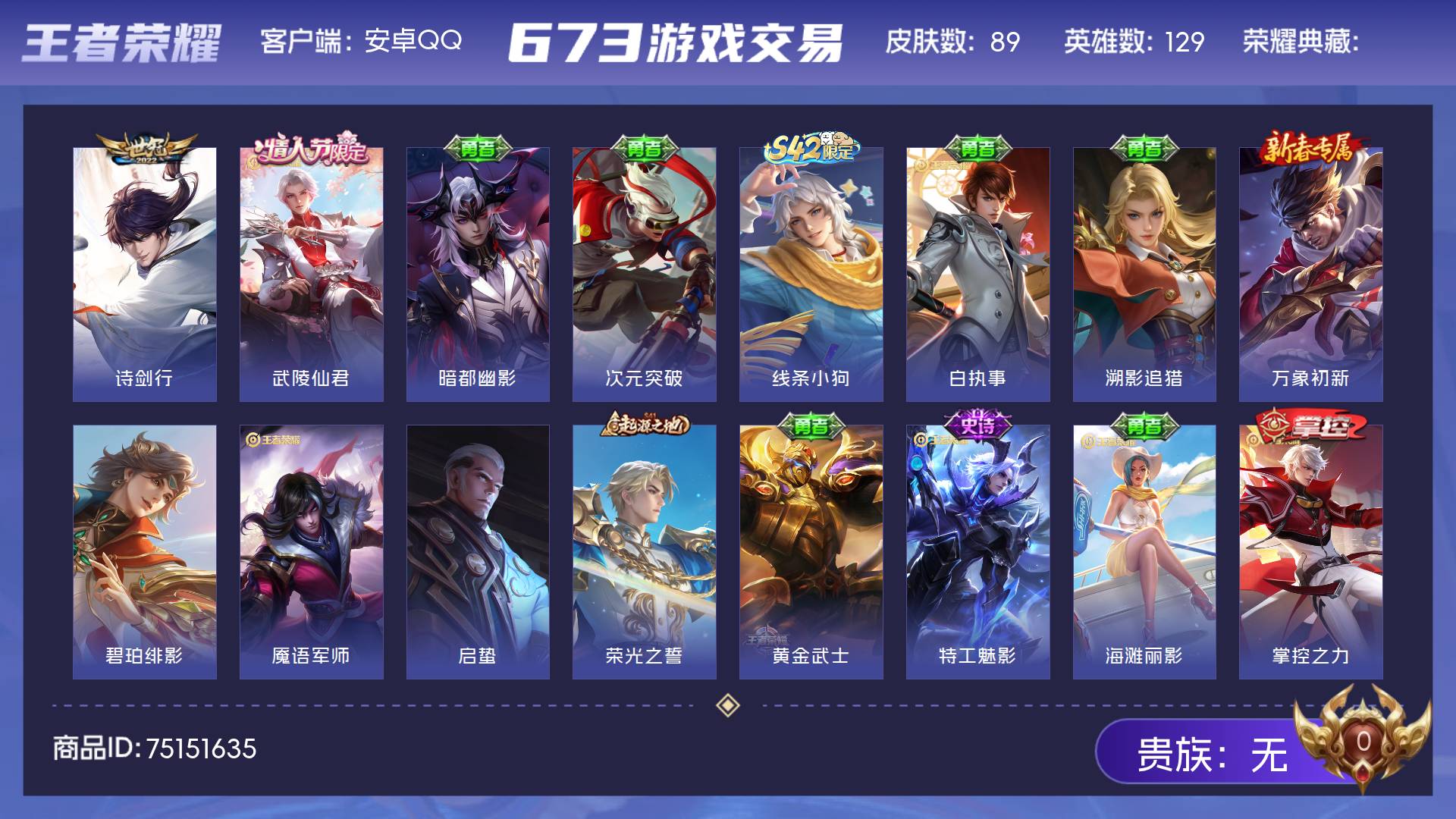 皮肤89 英雄129 至尊星耀 传说2 其他皮肤93