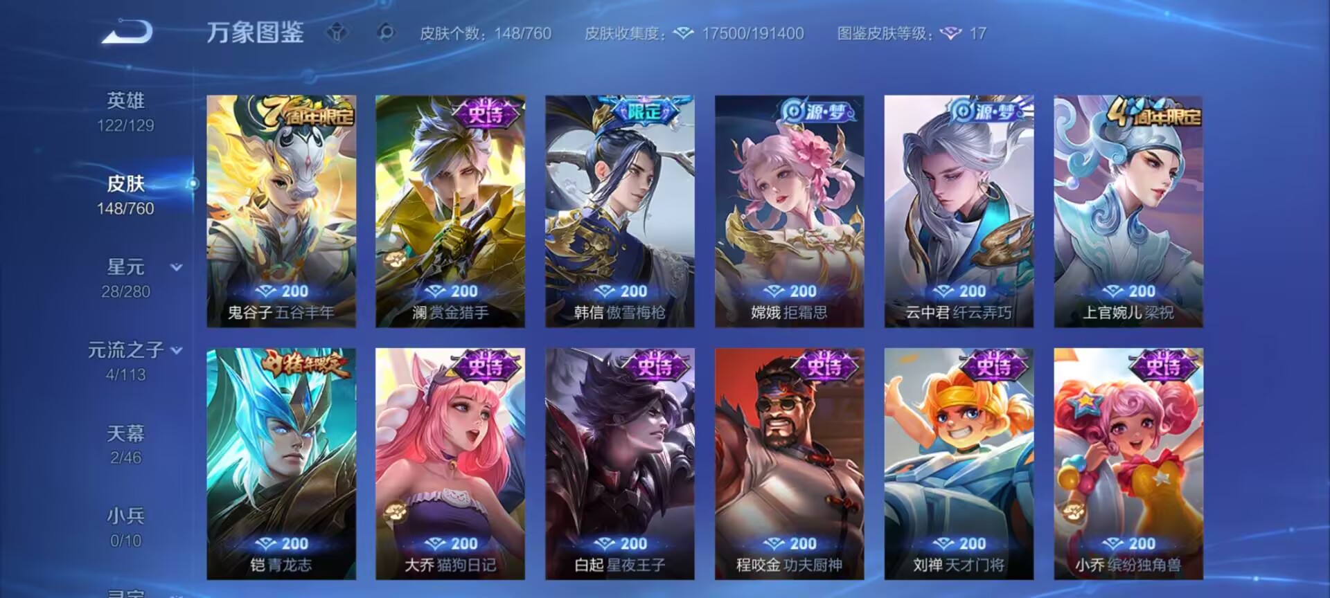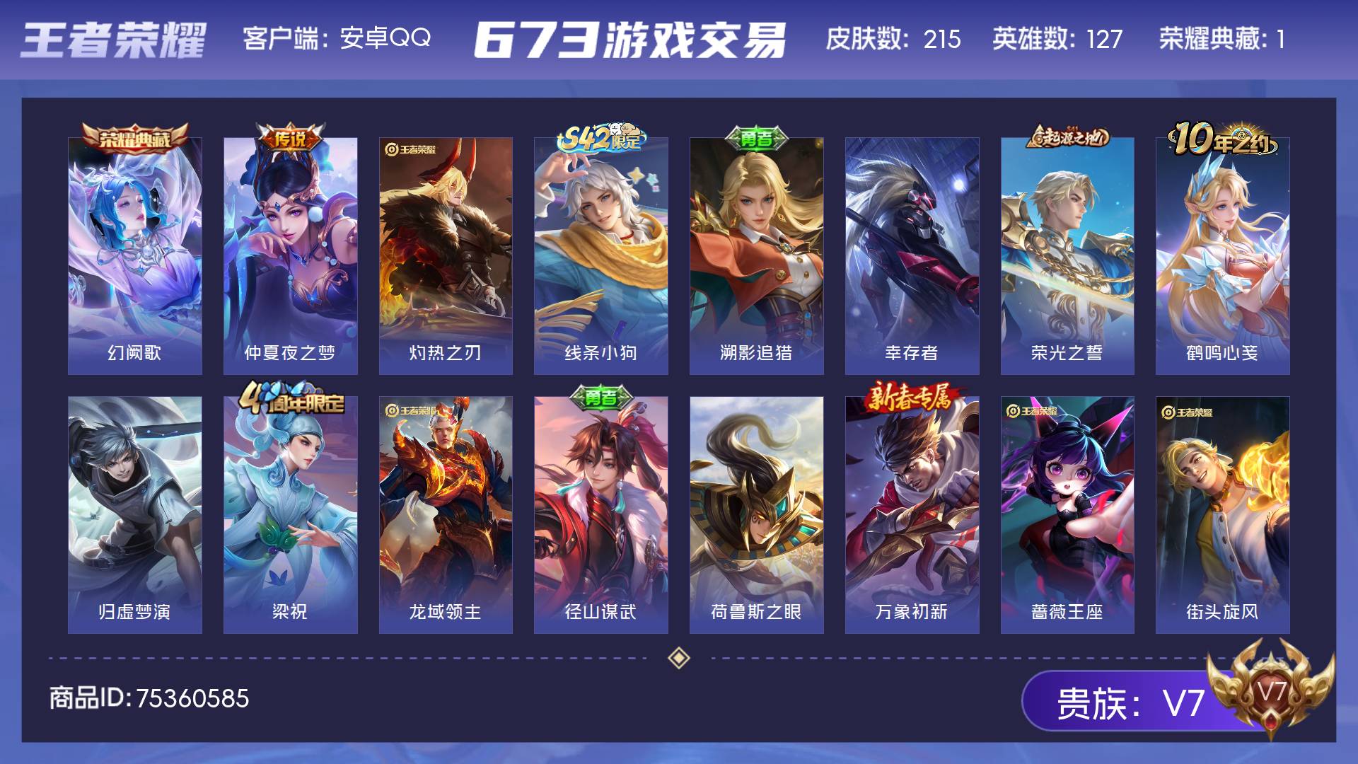 V7 皮肤215 英雄127 永恒钻石 荣耀典藏1 传说1 其他皮肤218