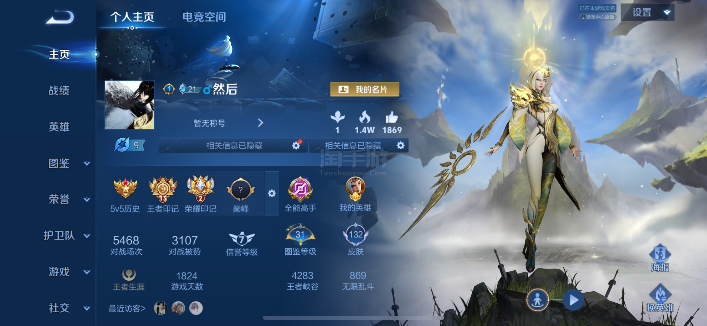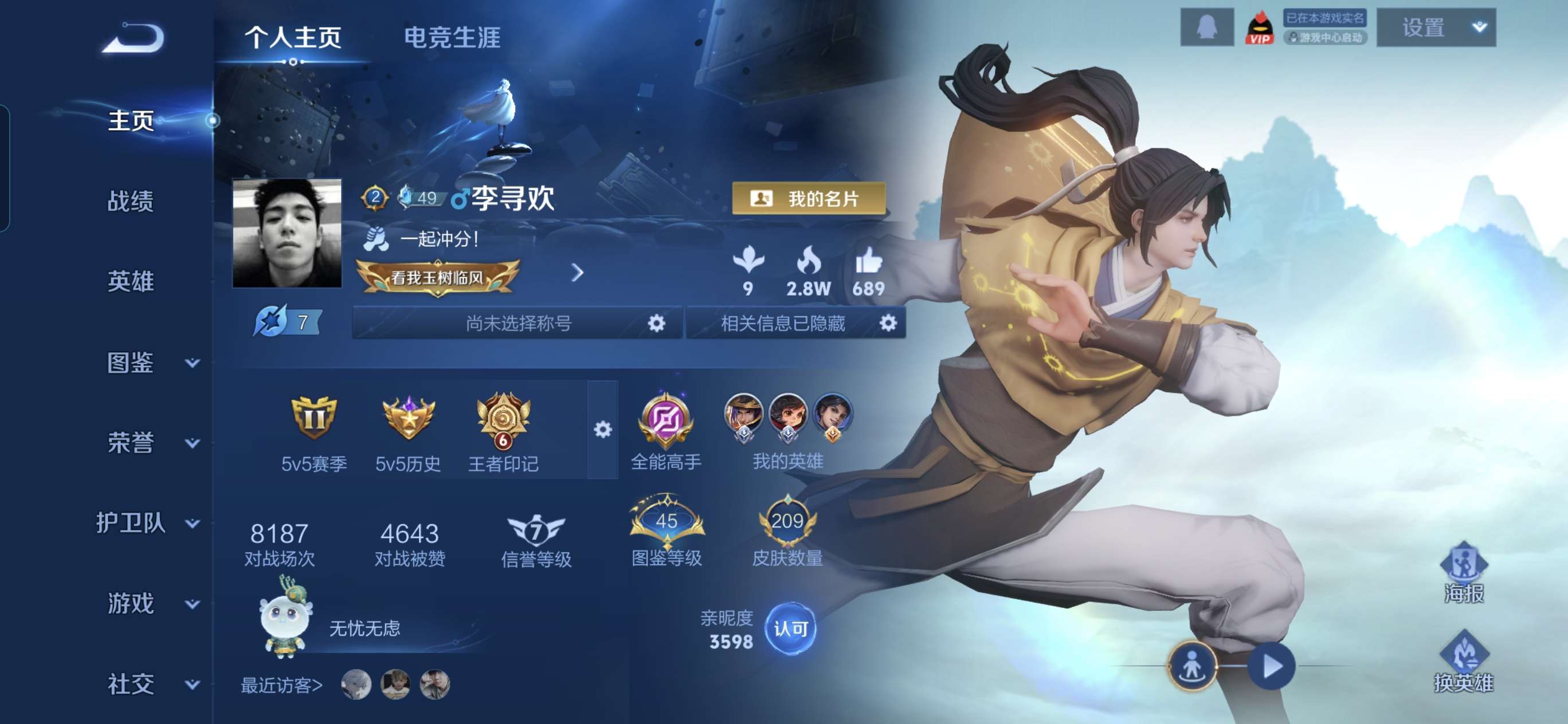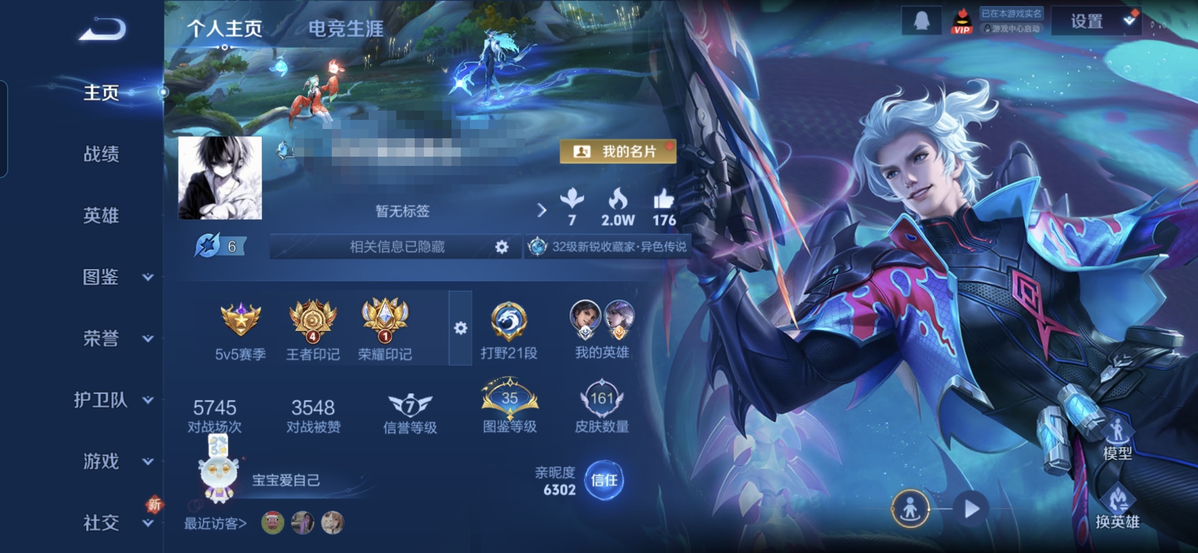 【王者荣耀连体和平精英】贵族等级: V5 英雄数: 104 皮肤数: 74 传