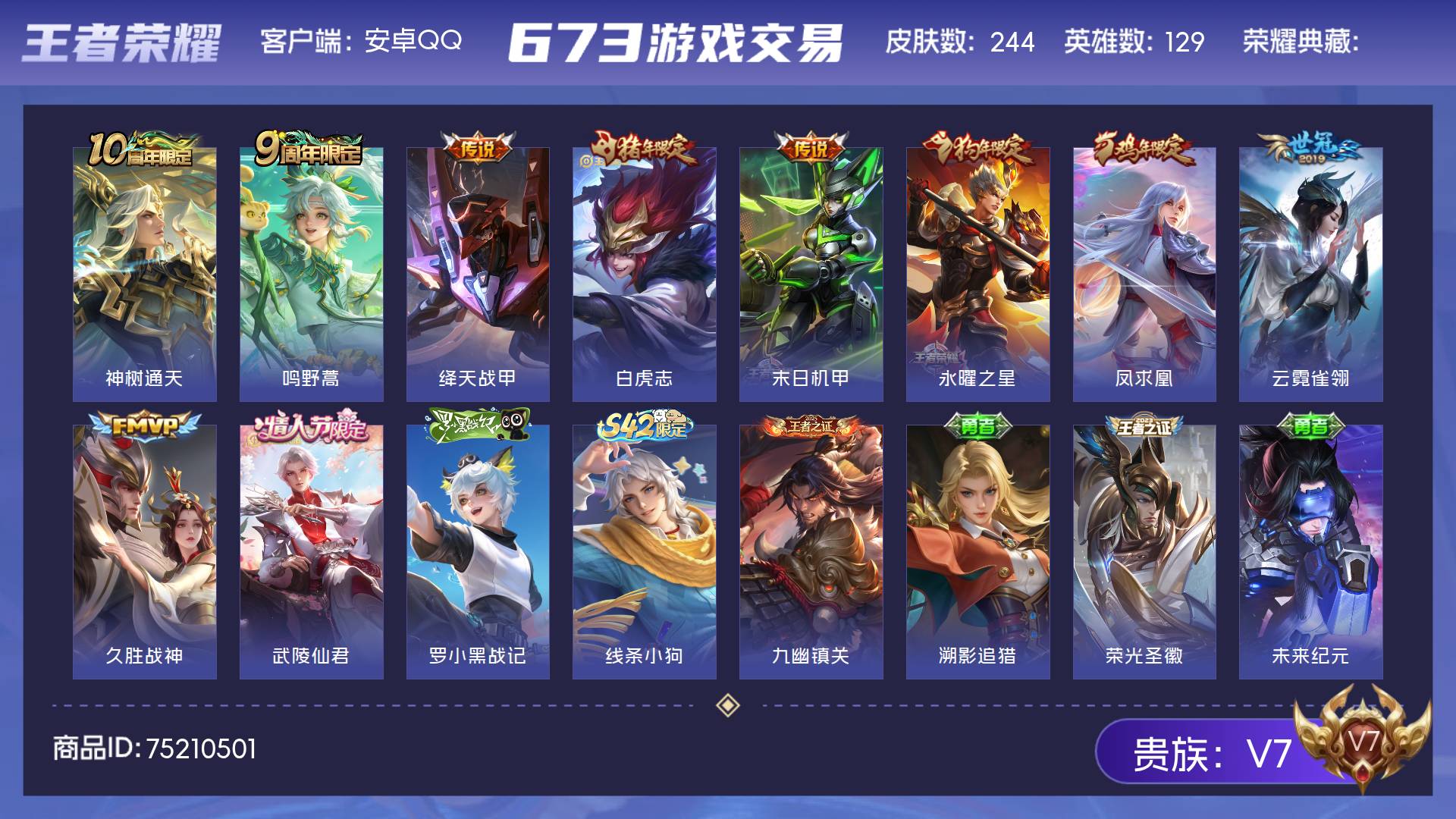 V7 皮肤244 英雄129 永恒钻石 传说10 其他皮肤240