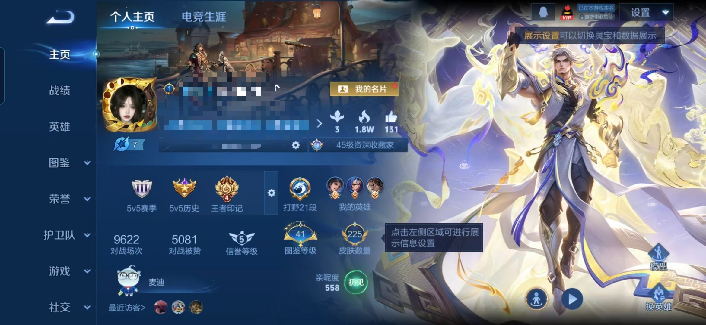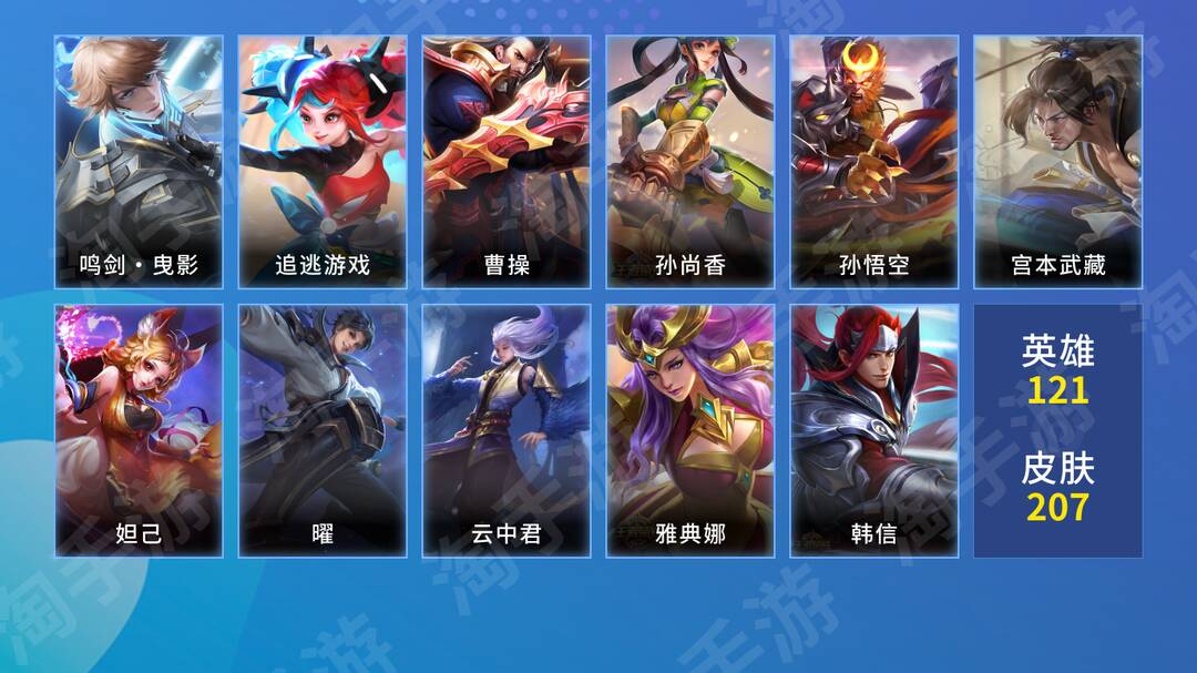 实名: 可修改 贵族等级: V7 英雄数: 121 皮肤数: 207 荣耀水晶: 鸣剑·曳影 限定皮