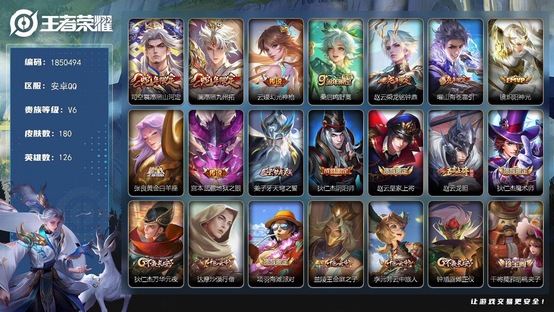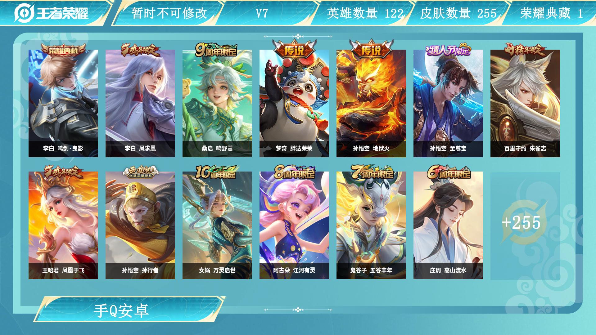 安卓Q-V7-永恒钻石I段位-126英雄-174皮肤-5传说-42史诗【英雄