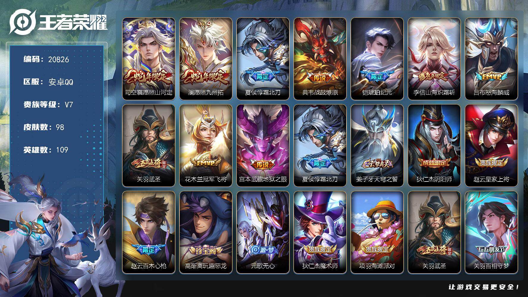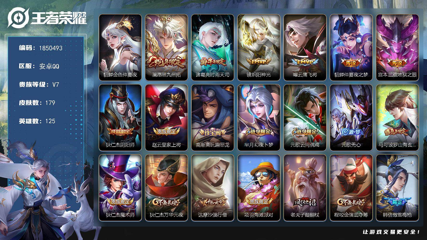 【金标李白 金标韩信】贵族等级: V7 英雄数: 125 皮肤数: 180 星