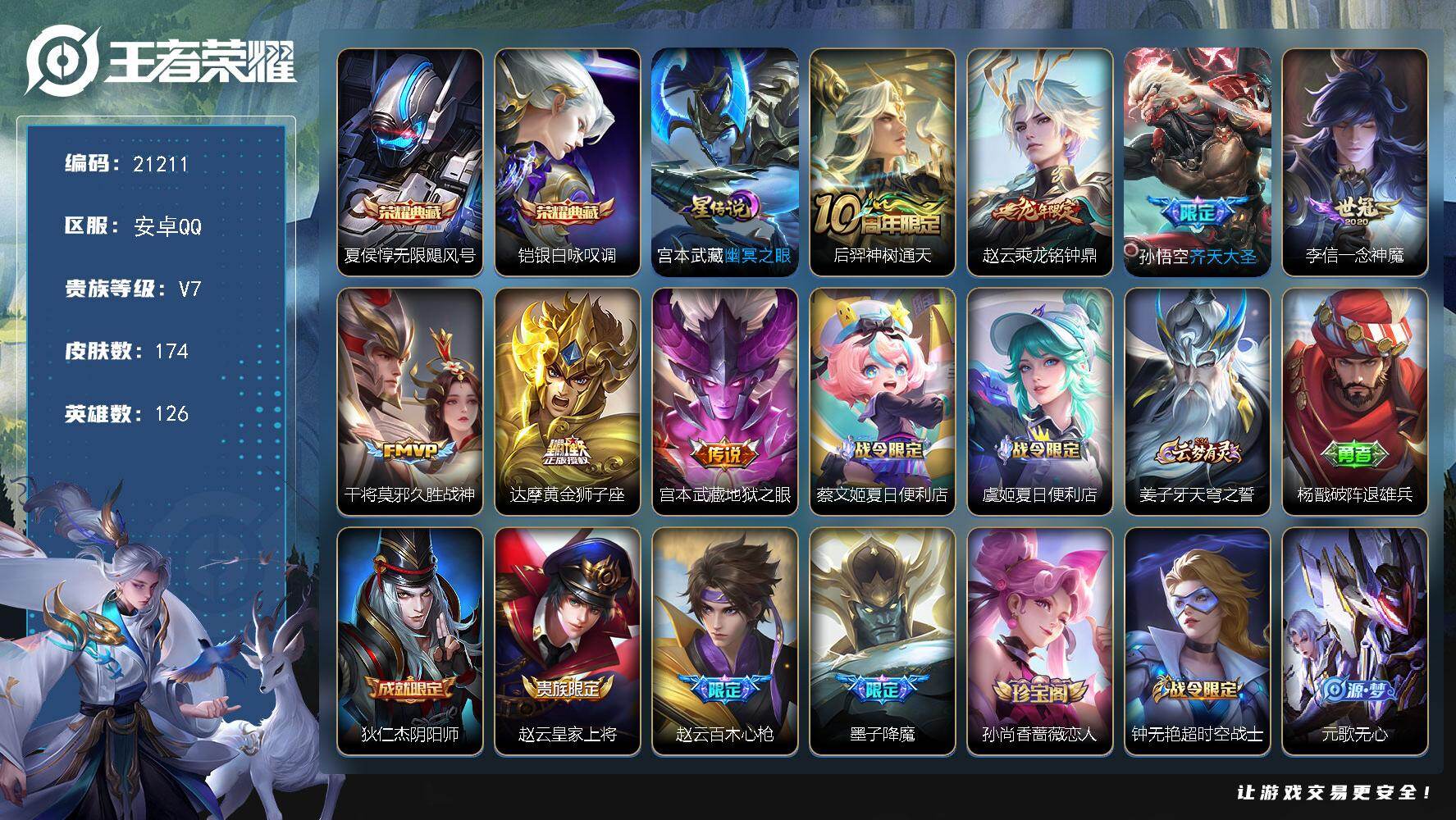 V6 皮肤174 英雄129 至尊星耀 荣耀典藏1 传说6 其他皮肤174
