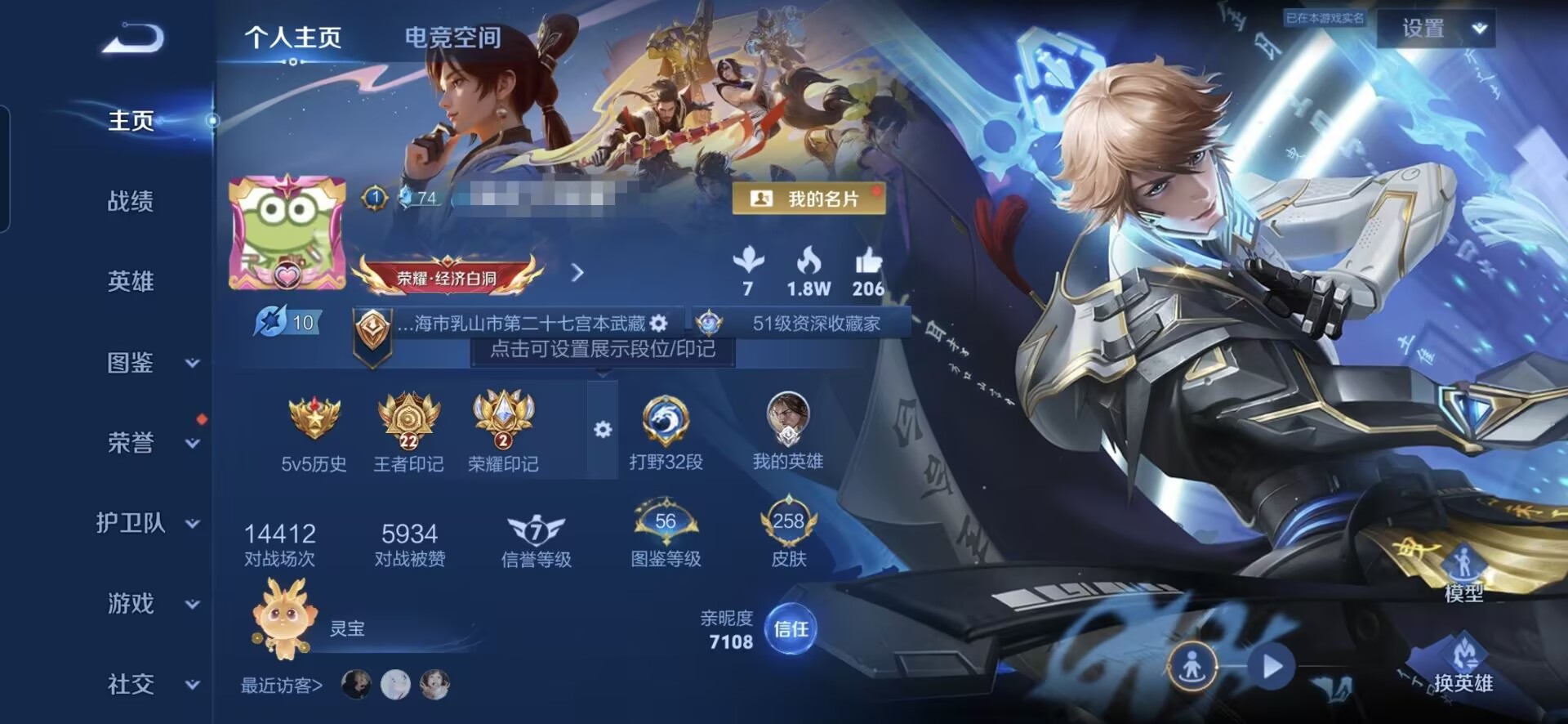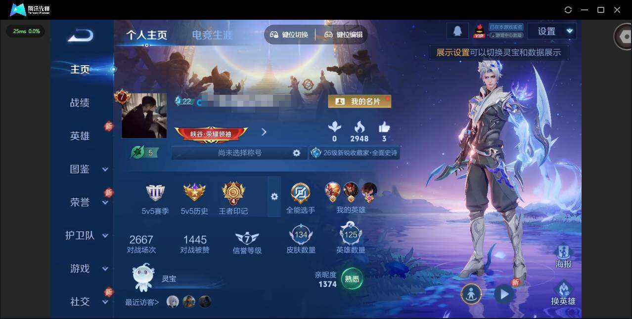贵族等级: V7 英雄数: 125 皮肤数: 134 星传说: 幽冥火 传说皮