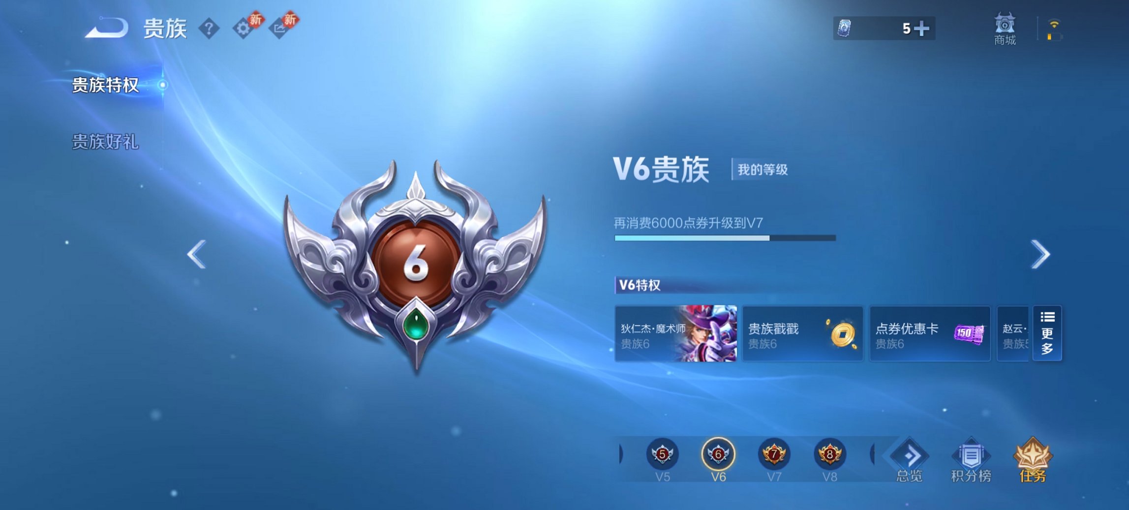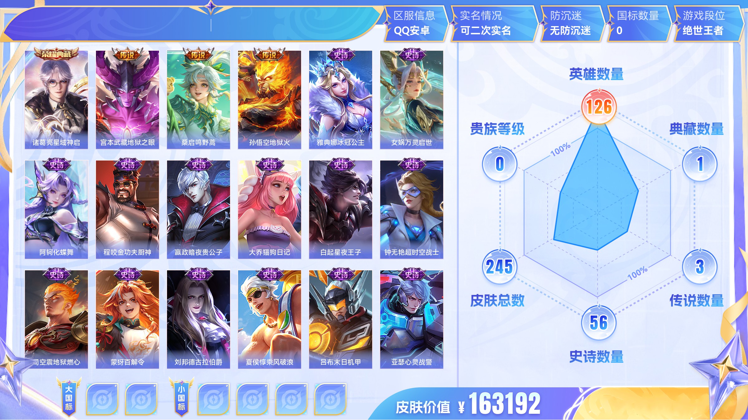 实名: 可修改 贵族等级: V7 英雄数: 126 皮肤数: 181 星传说: