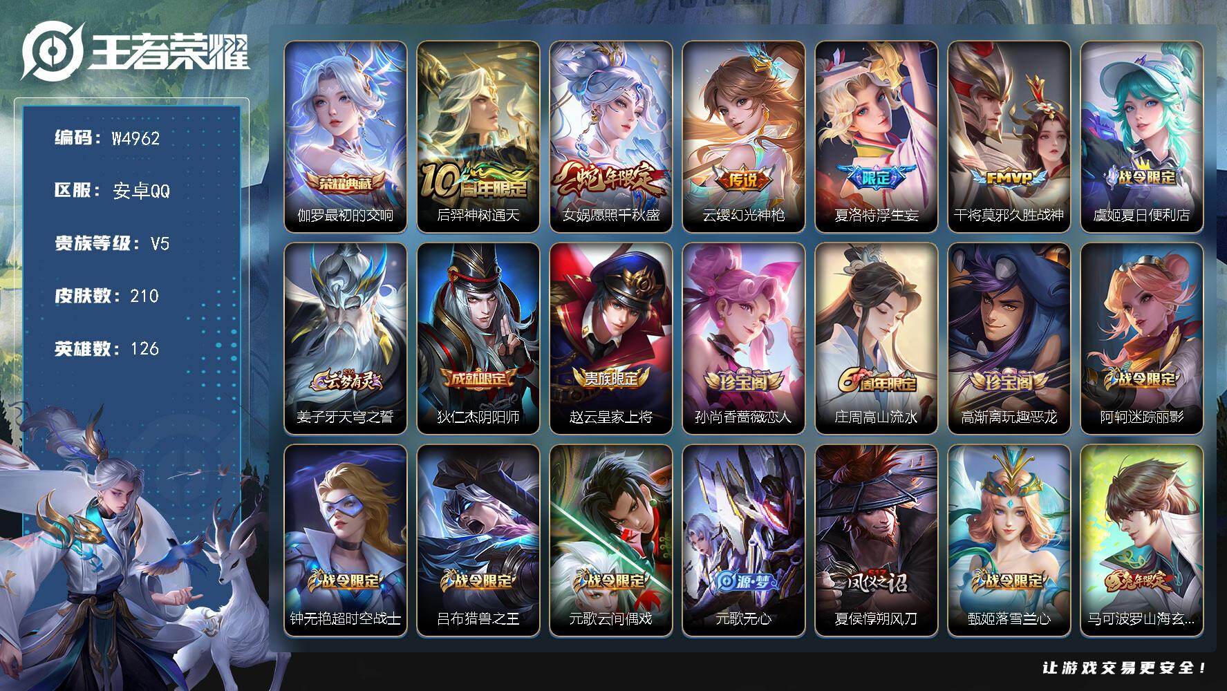 射手号!安卓Q-V6-最强王者段位-126英雄-137皮肤-0典藏-0珍品无双