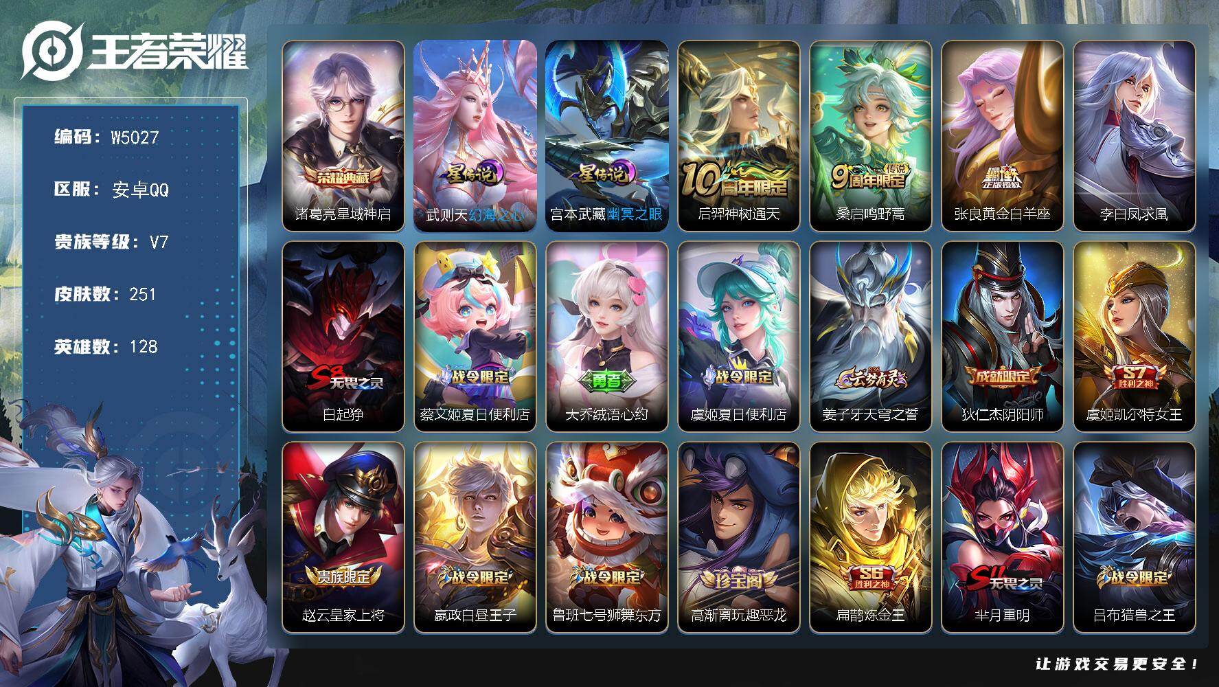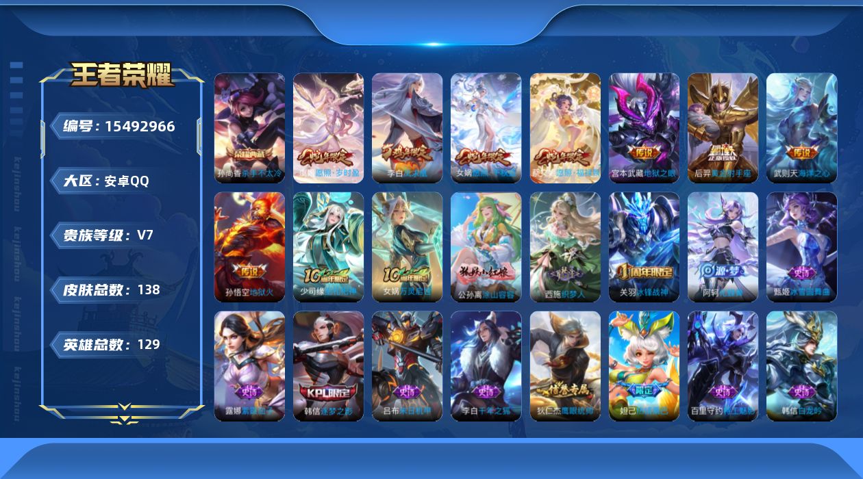 实名: 可修改 贵族等级: V7 英雄数: 128 皮肤数: 163 星传说: