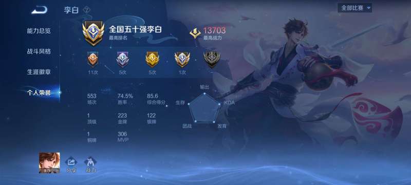 贵族等级: V6 英雄数: 125 皮肤数: 152 荣耀水晶: 九霄神辉 传