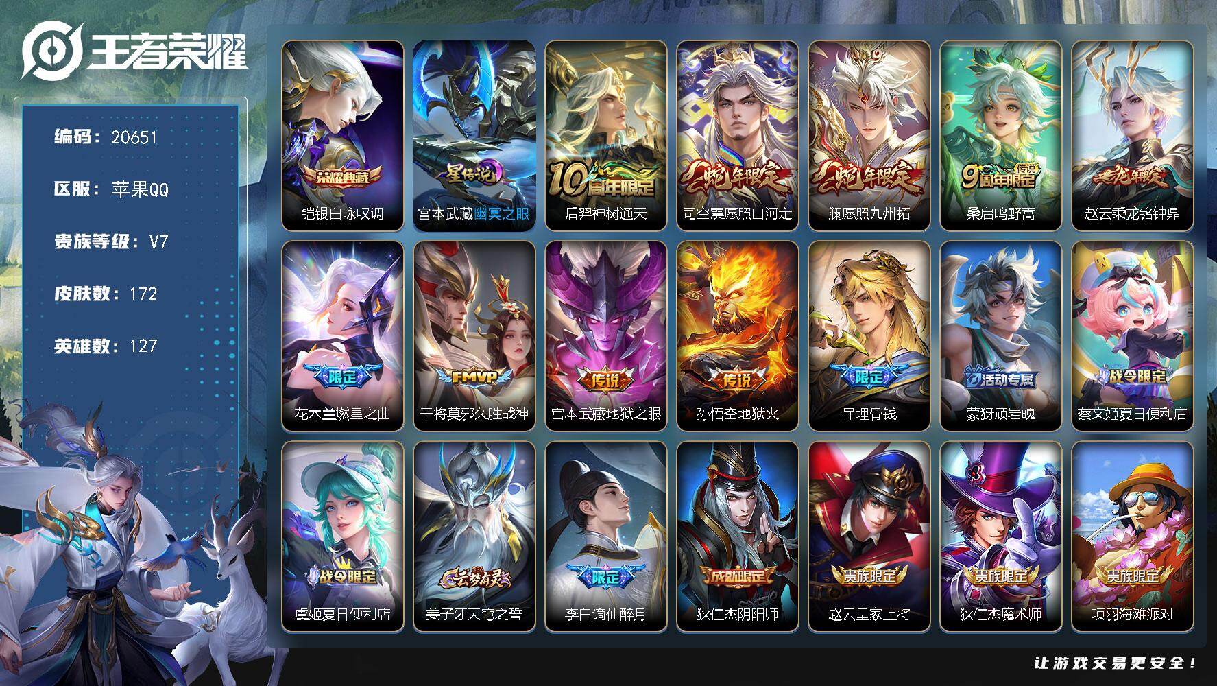 【金标孙策】贵族等级: V7 英雄数: 126 皮肤数: 235 珍品传说: