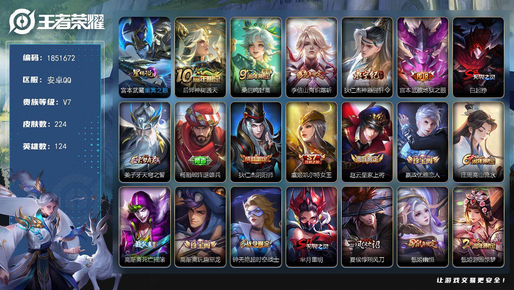 【2水晶1星元7传说1天幕可秒换绑】安卓QQ-124英雄-