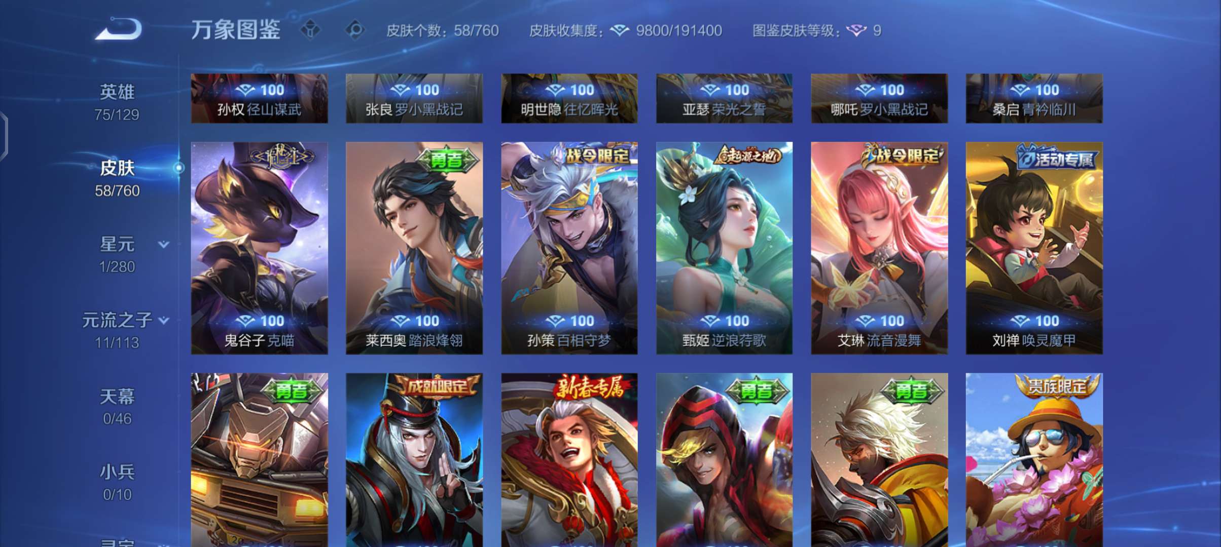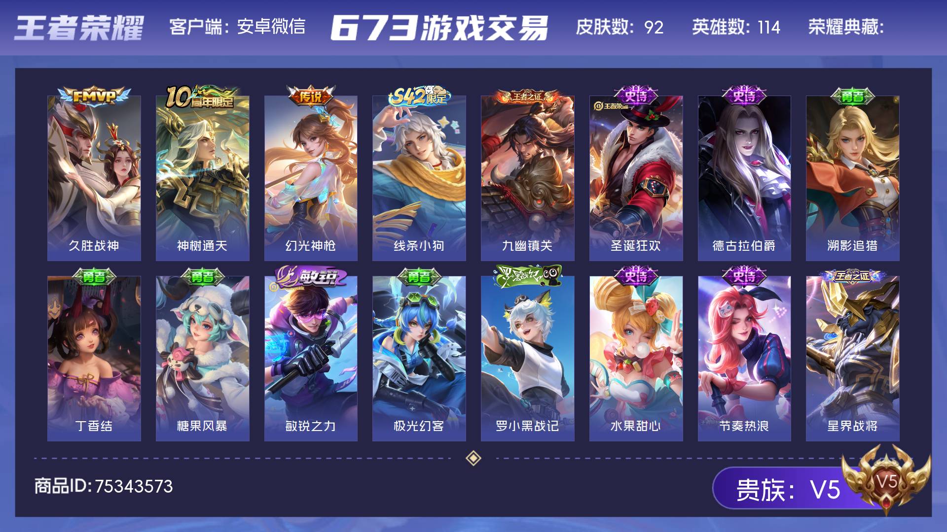 V5 皮肤92 英雄114 至尊星耀 传说3 其他皮肤95