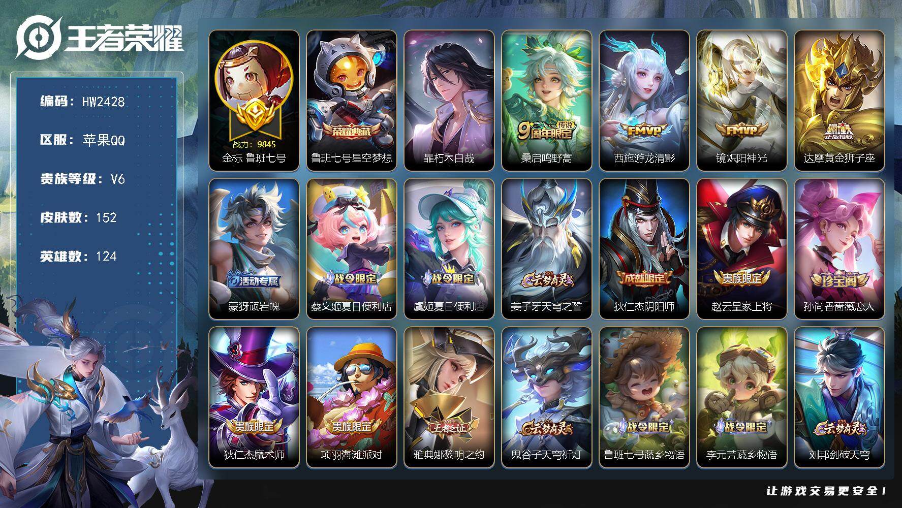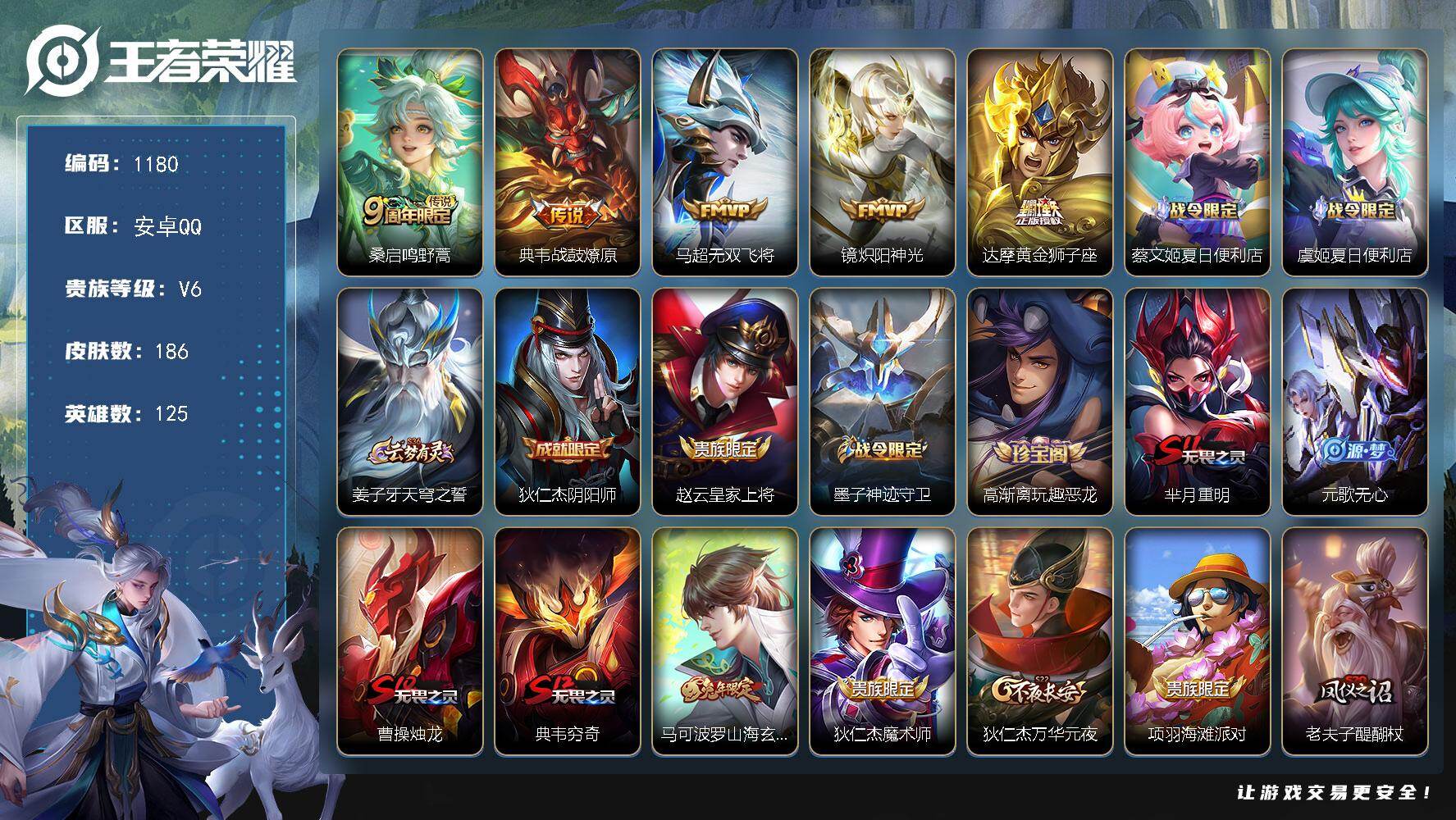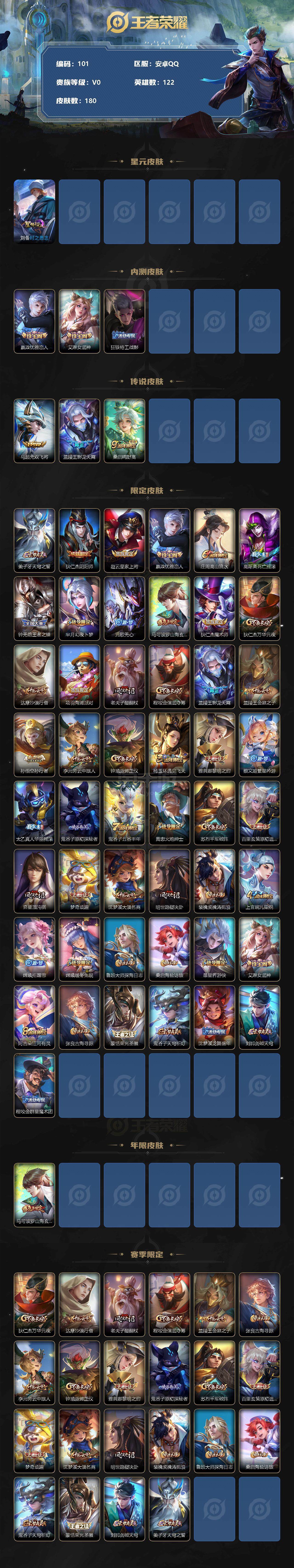 安卓Q-V6-最强王者段位-125英雄-180皮肤-1典藏-0珍品无双-0无双