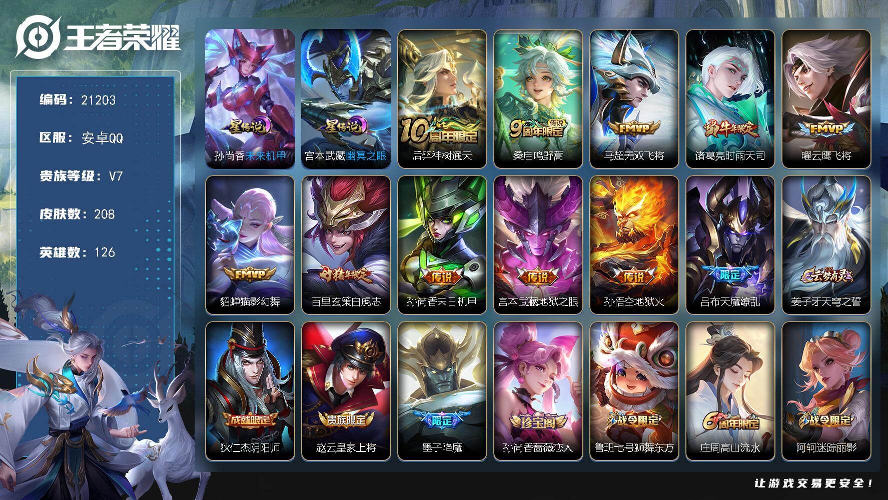 安卓QQ-2典藏-5传说-273皮肤-126英雄-至尊星耀-双典藏,冰封战神至尊宝等等,便宜卖了