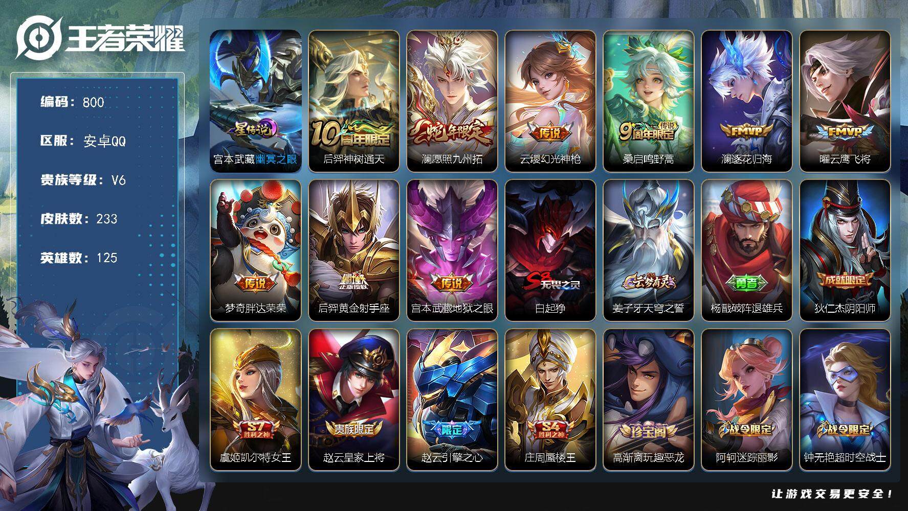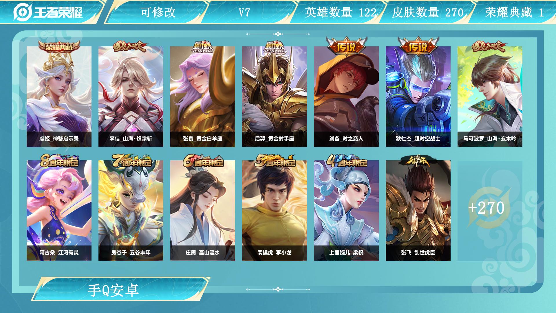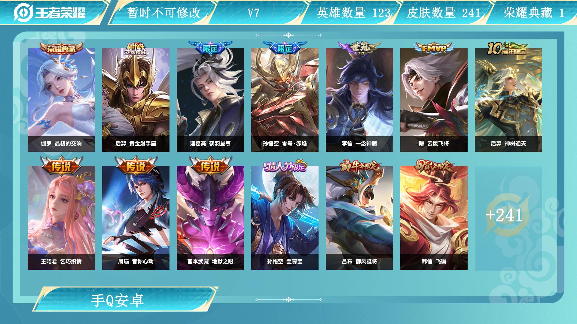 安卓QQ-2典藏-3传说-183皮肤-125英雄-至尊星耀-