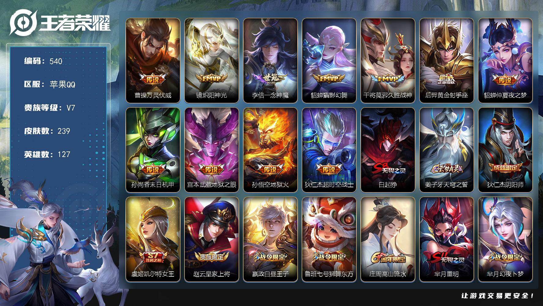 苹果Q-V7-最强王者段位-127英雄-239皮肤-11传说-55史诗【英雄