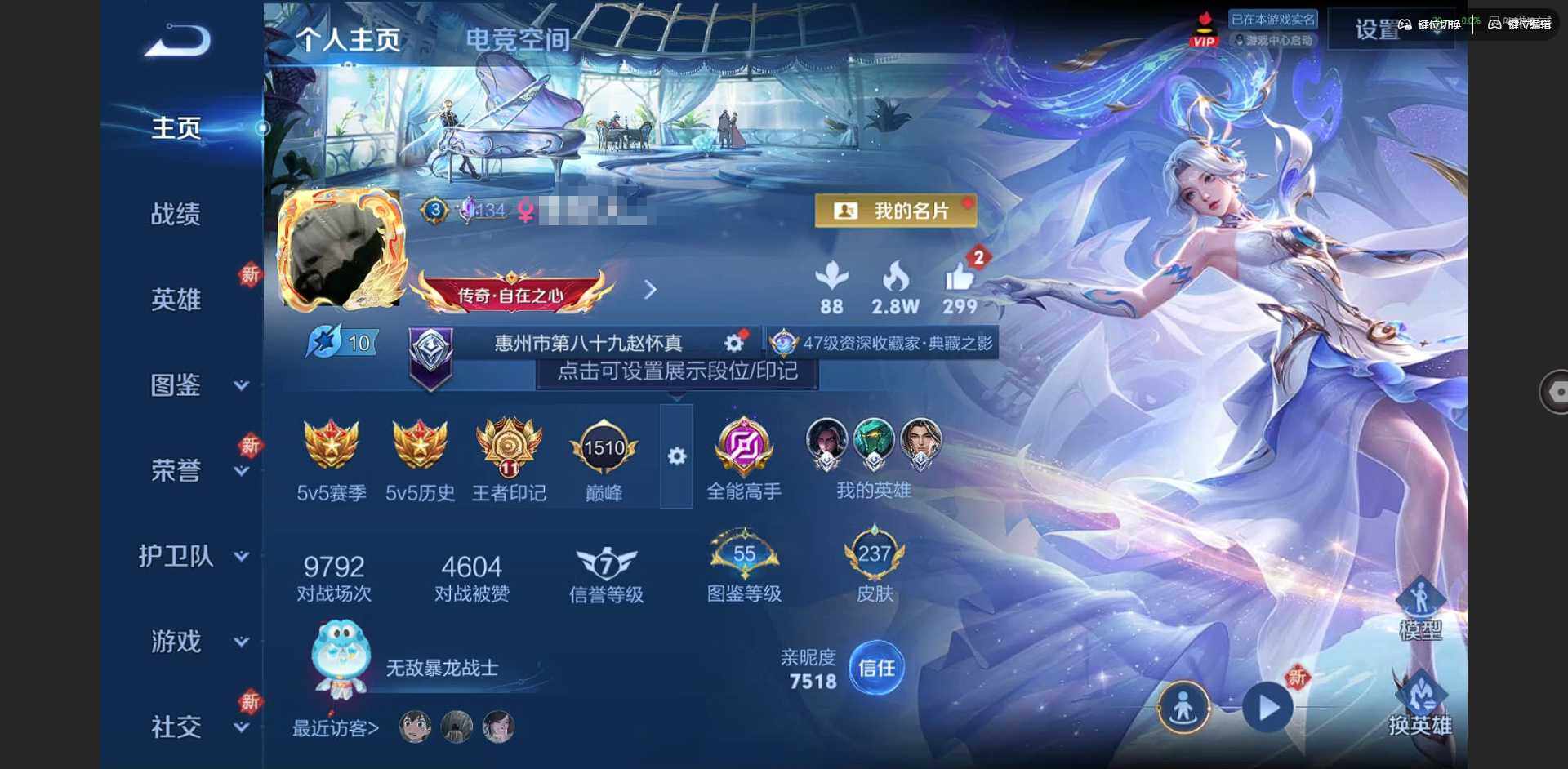 实名: 可修改 贵族等级: V6 英雄数: 124 皮肤数: 237 荣耀水晶