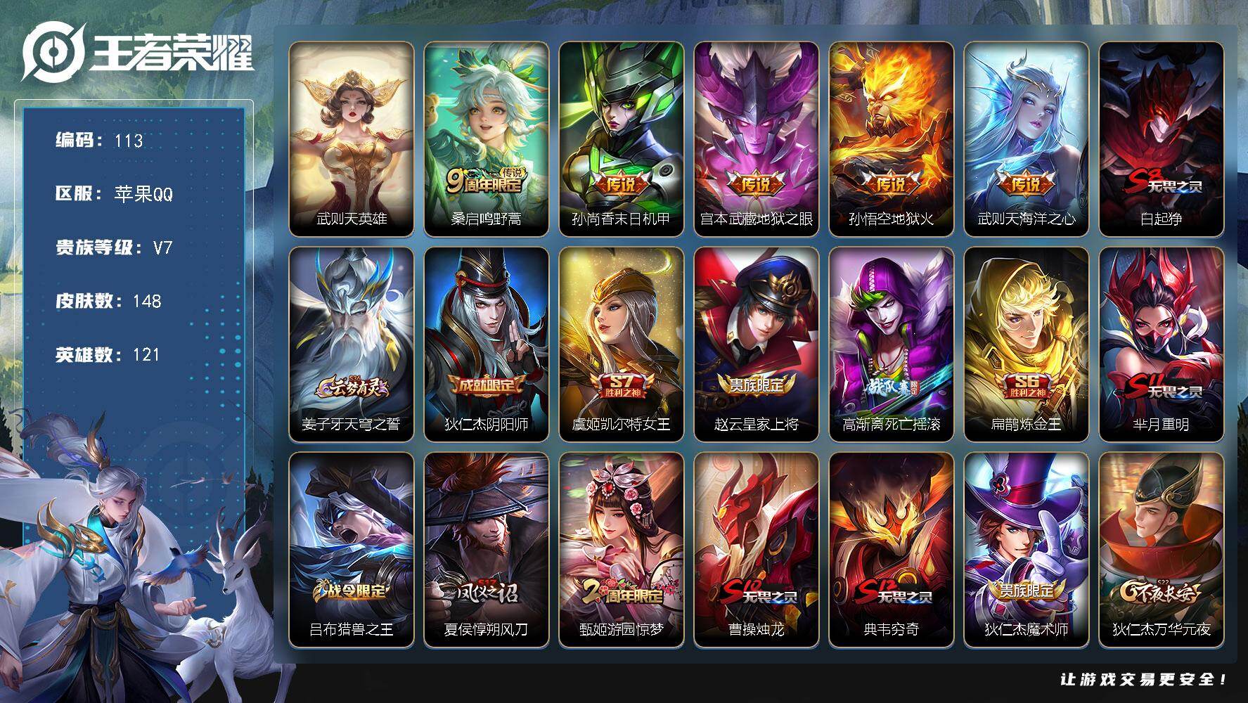 连体号 和平苹果Q-V7-尊贵铂金II段位-121英雄-148皮肤-1典藏英