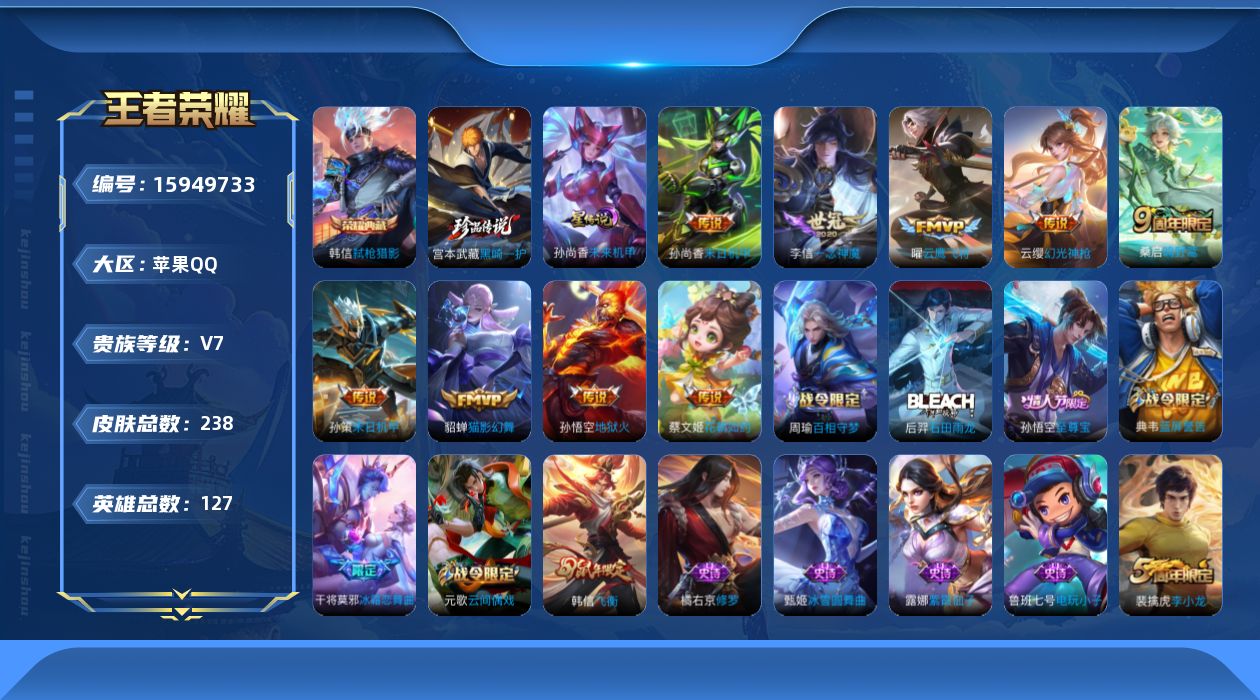 苹果Q-V0-尊贵铂金II段位-127英雄-210皮肤-9传说-44史诗【传