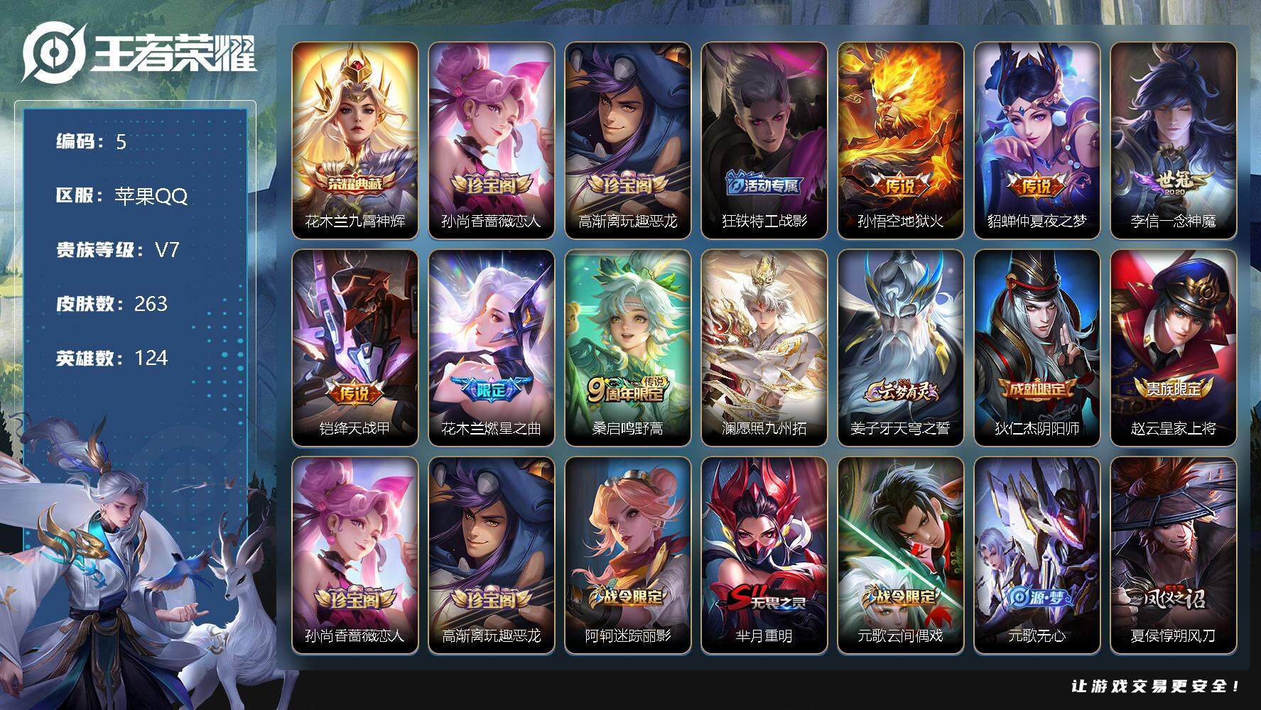 【商品标题】:苹果Q-V7-至尊星耀IV段位-124英雄-263皮肤-1典藏-