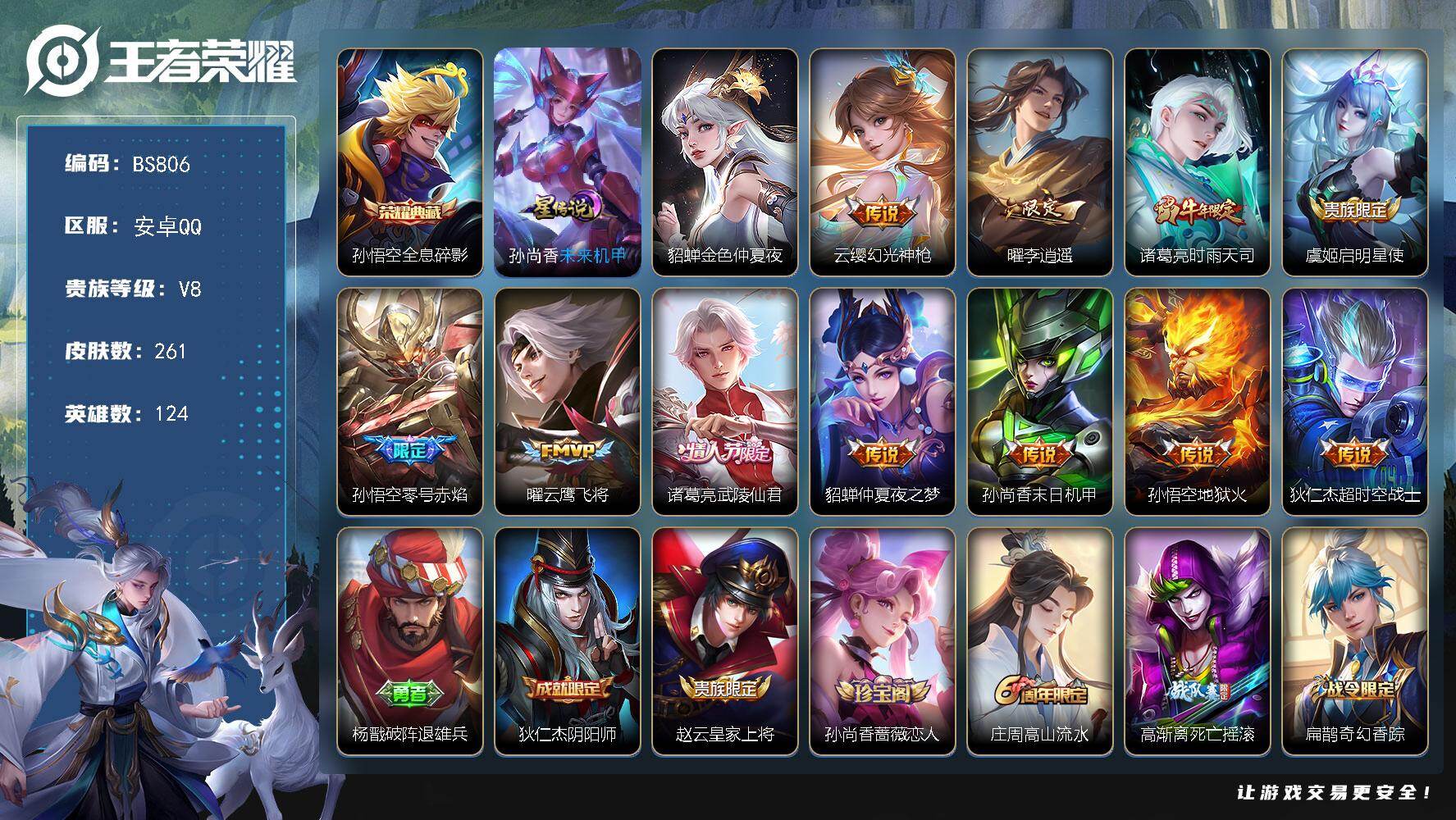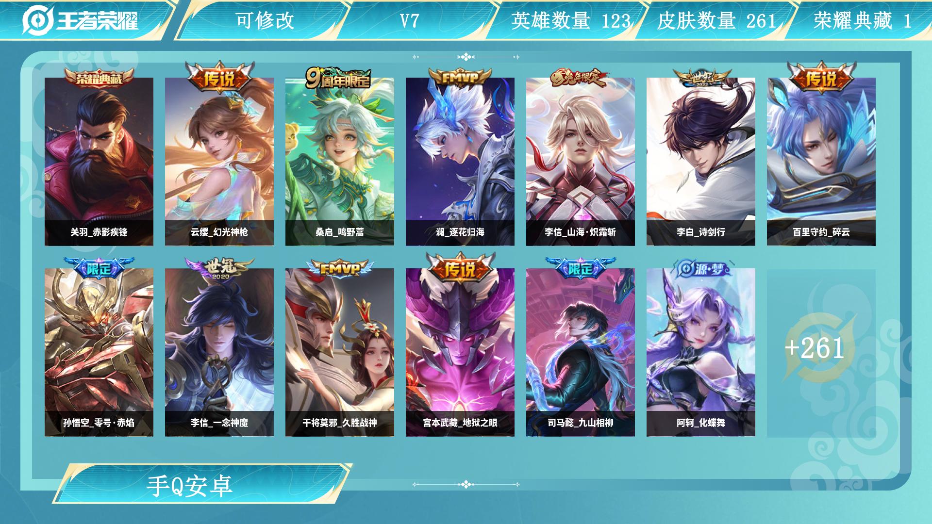 安卓Q-V8-最强王者段位-124英雄-261皮肤-1典藏皮肤-11传说-61