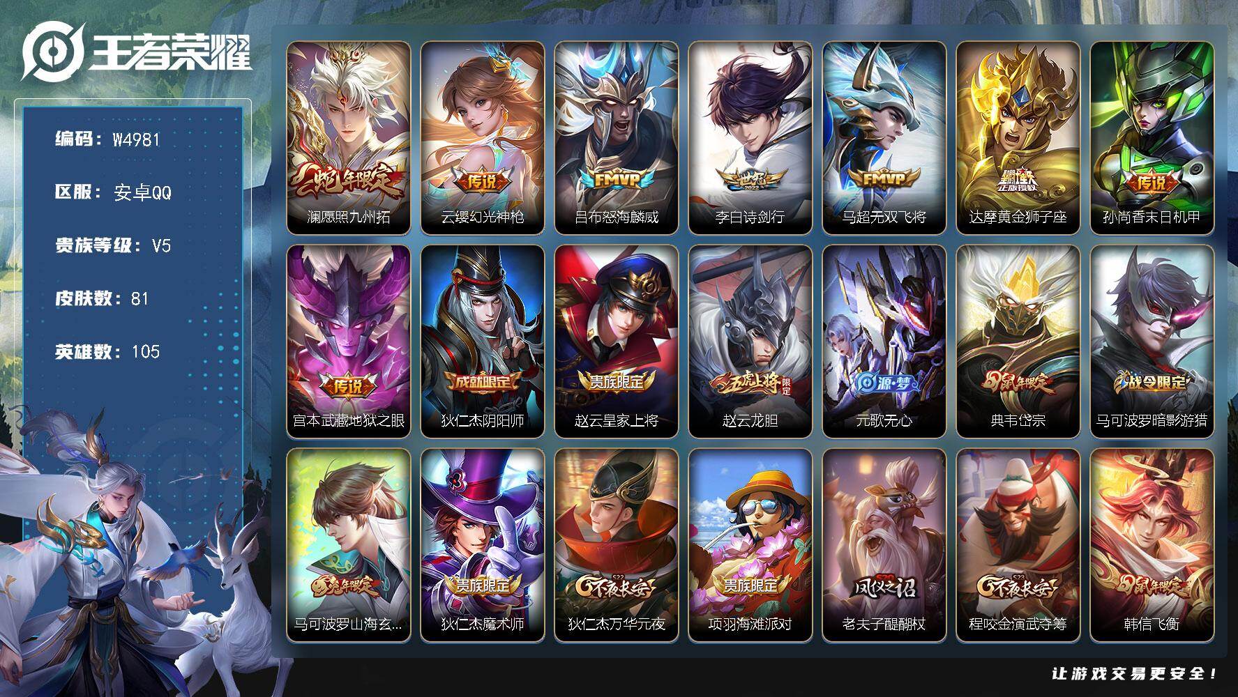可二次-贵6-105英雄-81皮肤-8传说-23史诗-32限定-9按键-